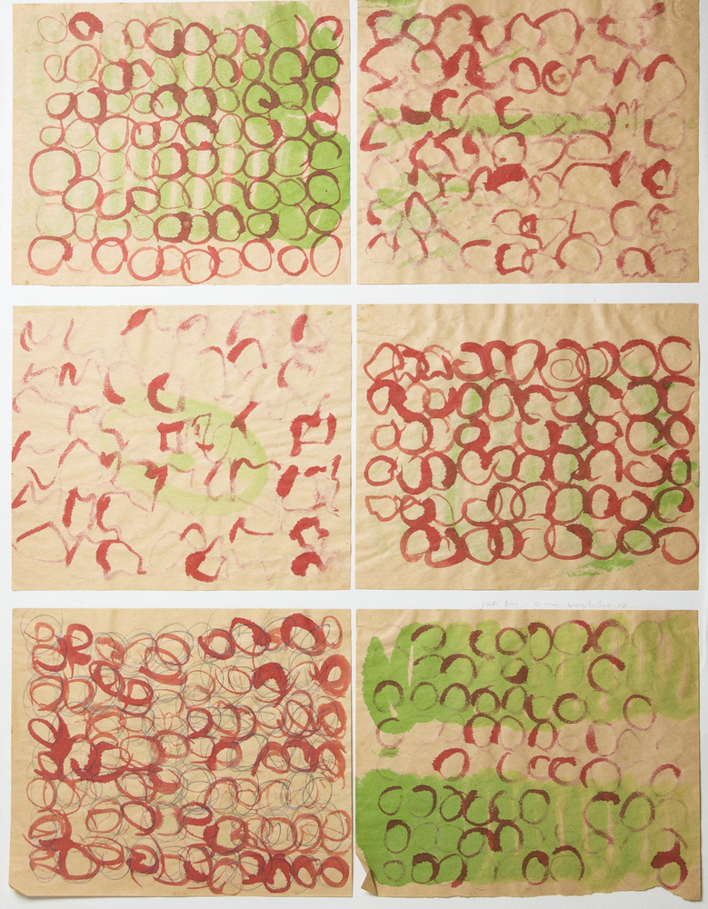 Zes tekeningen van cirkels met verf