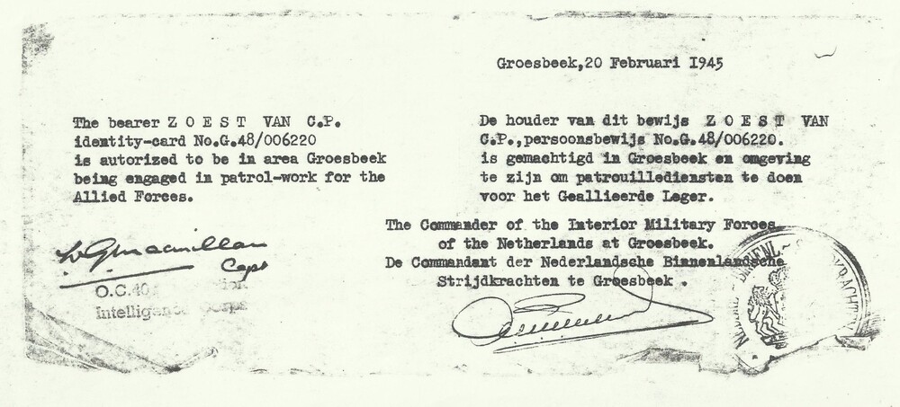 Kopie permit Dhr. van Zoest dd. 20 feb. 1945