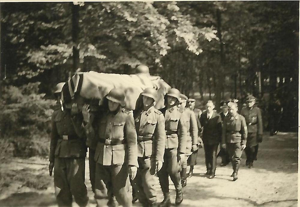 begrafenis Duitse soldaat, dragers met kist en volgers