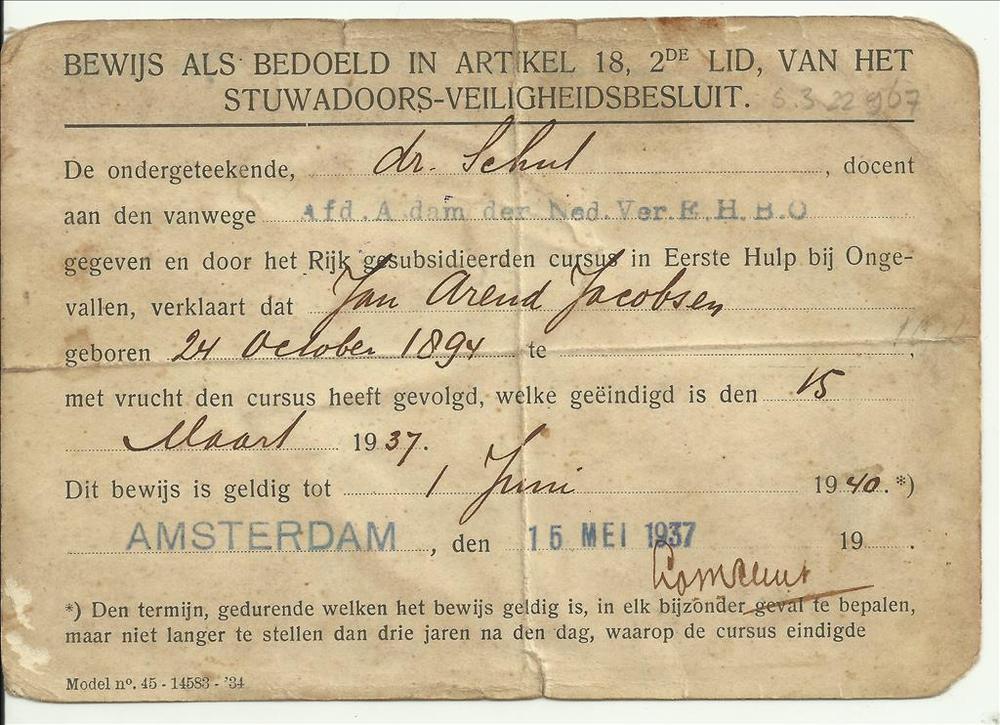 Bewijs voltooing EHBO cursus voor J.A. Jacobsen, 15 ...