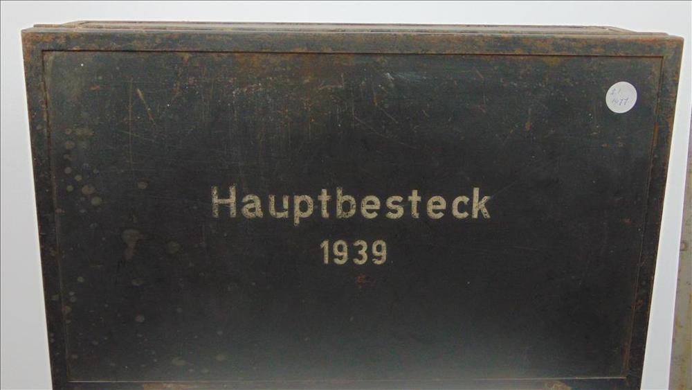 Kist gemaakt van metaal met het opschrift: Hauptbest...