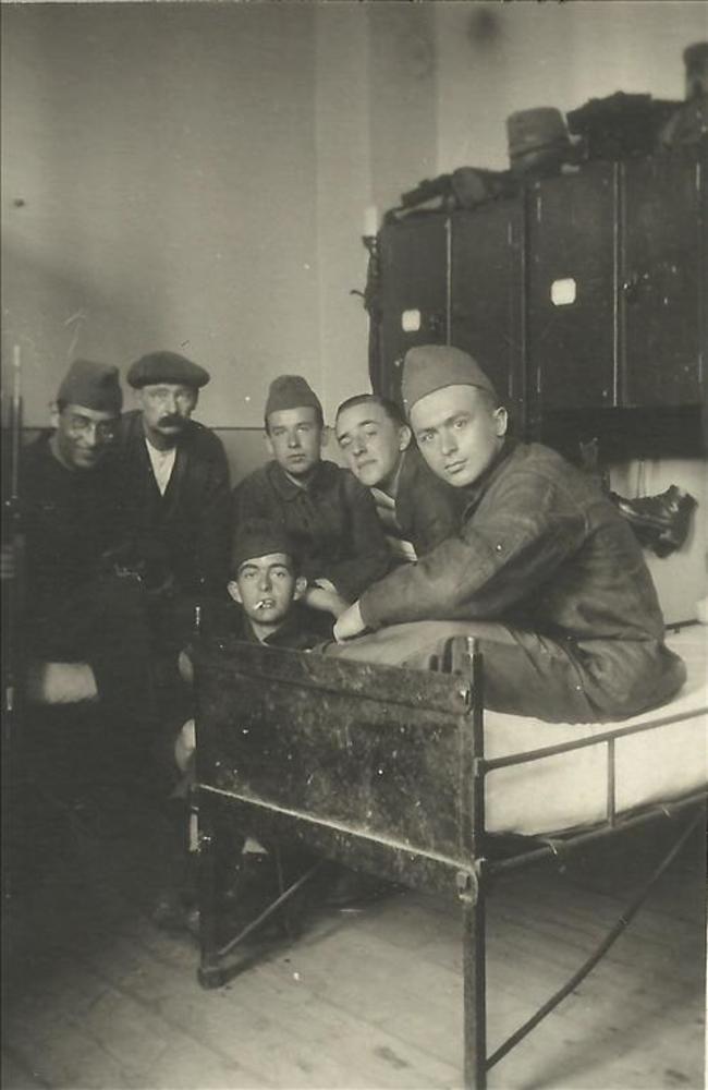 vijf Nederlandse militairen en burger in slaapzaal