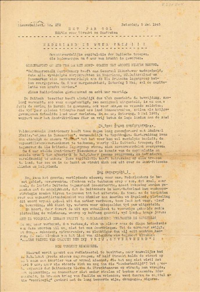 Het Parool, zaterdag 5 mei 1945, editie voor Utrecht...