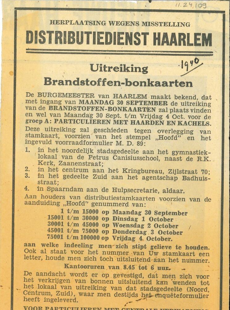 Mededeling uitreiking brandstoffen-bonkaart 1940
