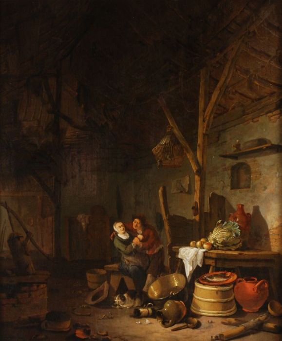 Boereninterieur met 'stoeiend' paar en stilleven op ...