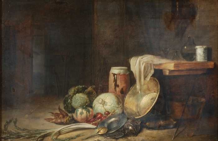 Interieur met stilleven van groente en vaatwerk