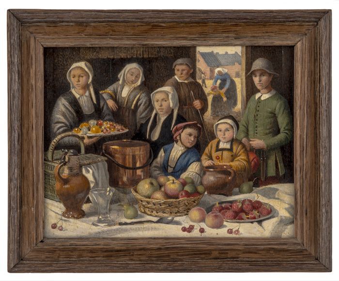 Klein schilderijtje van middeleeuws boerengezin bij ...