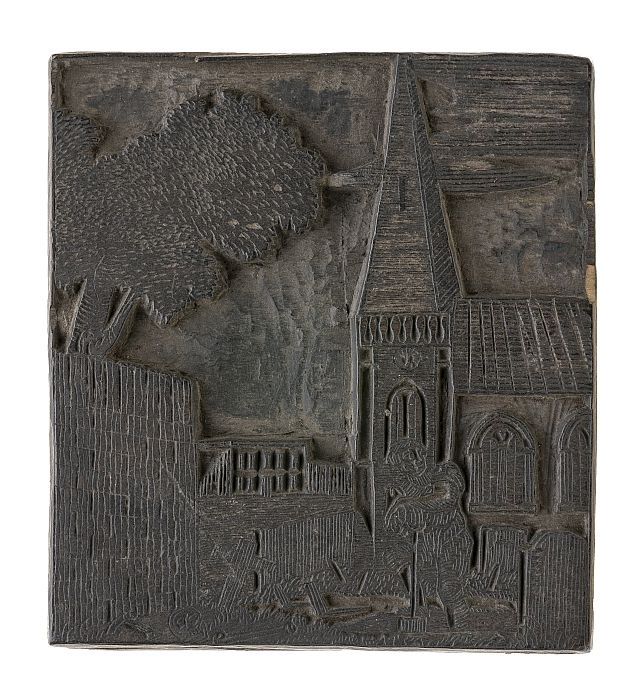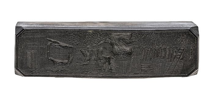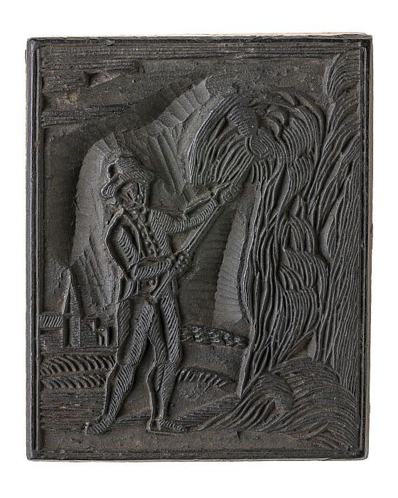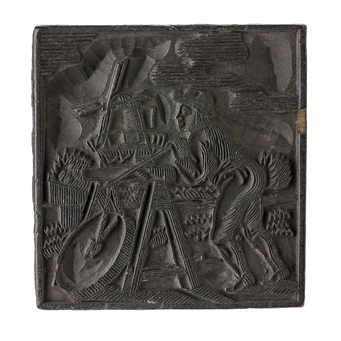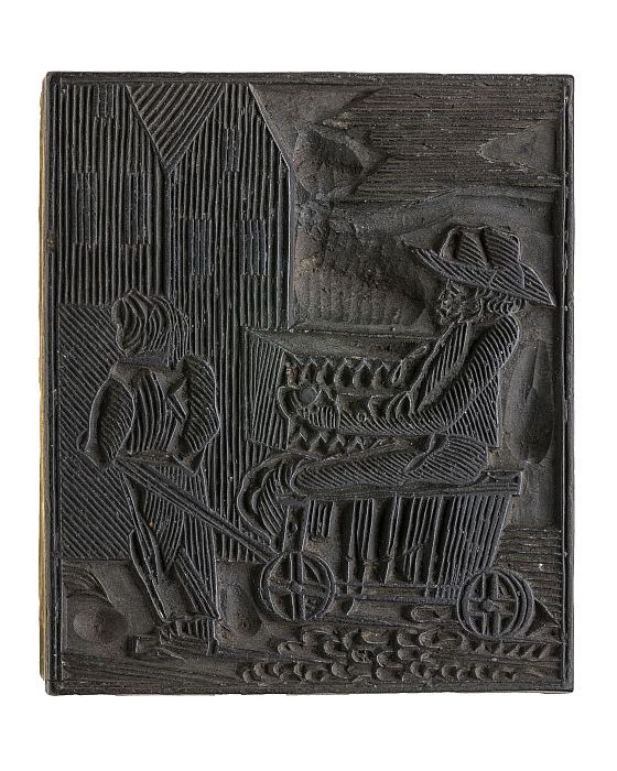 Houten cliché met man met een graanmand (?) met hout...