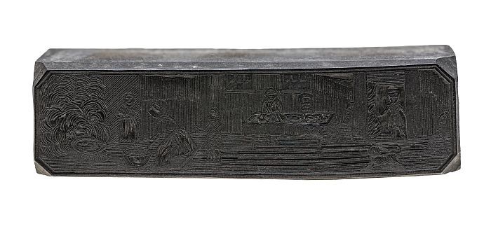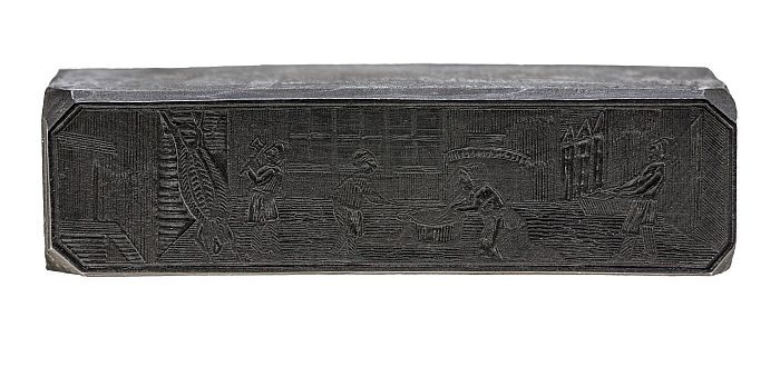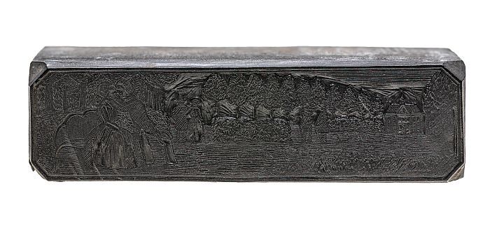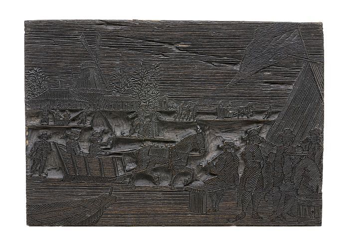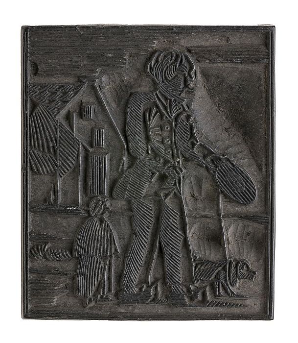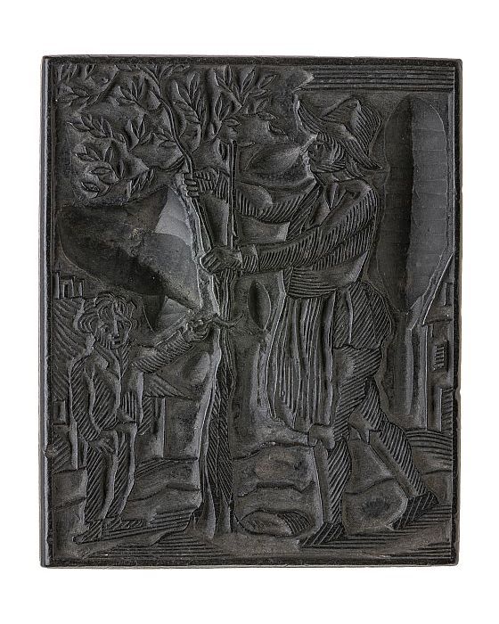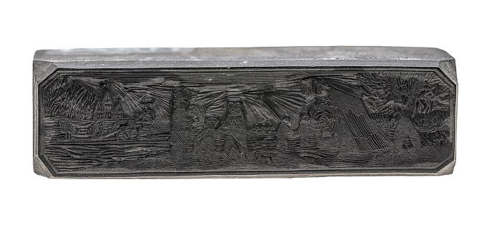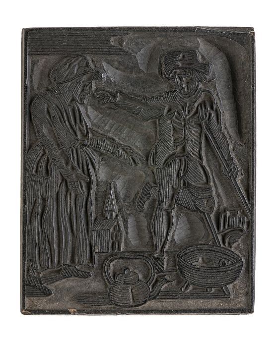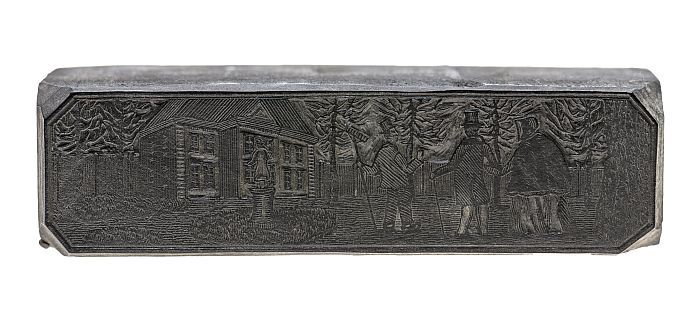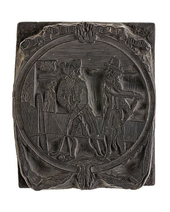 Houten cliché met twee mannen met stick en bal bezig...