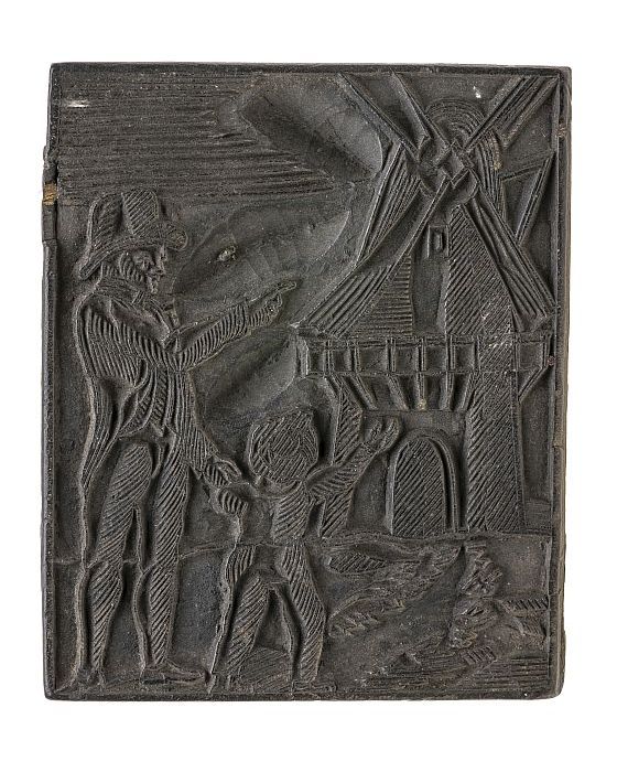 Houten cliché met man en kind wijzend naar een molen