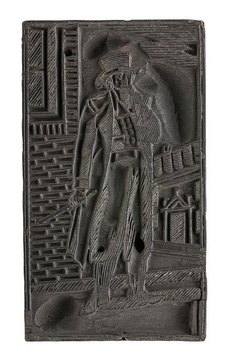 Houten cliché met man met hoed in de hand
