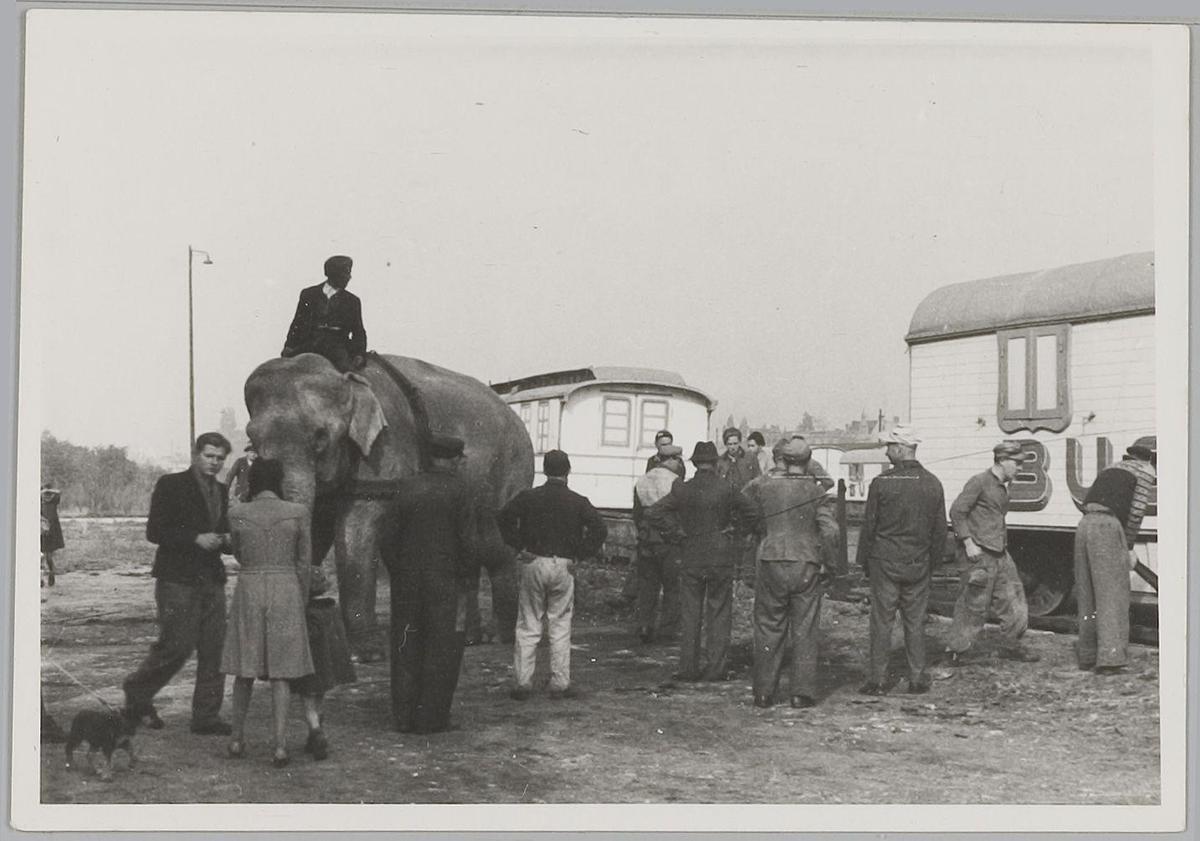 Circus Bouglione. Uitladen der olifanten bij het cir...