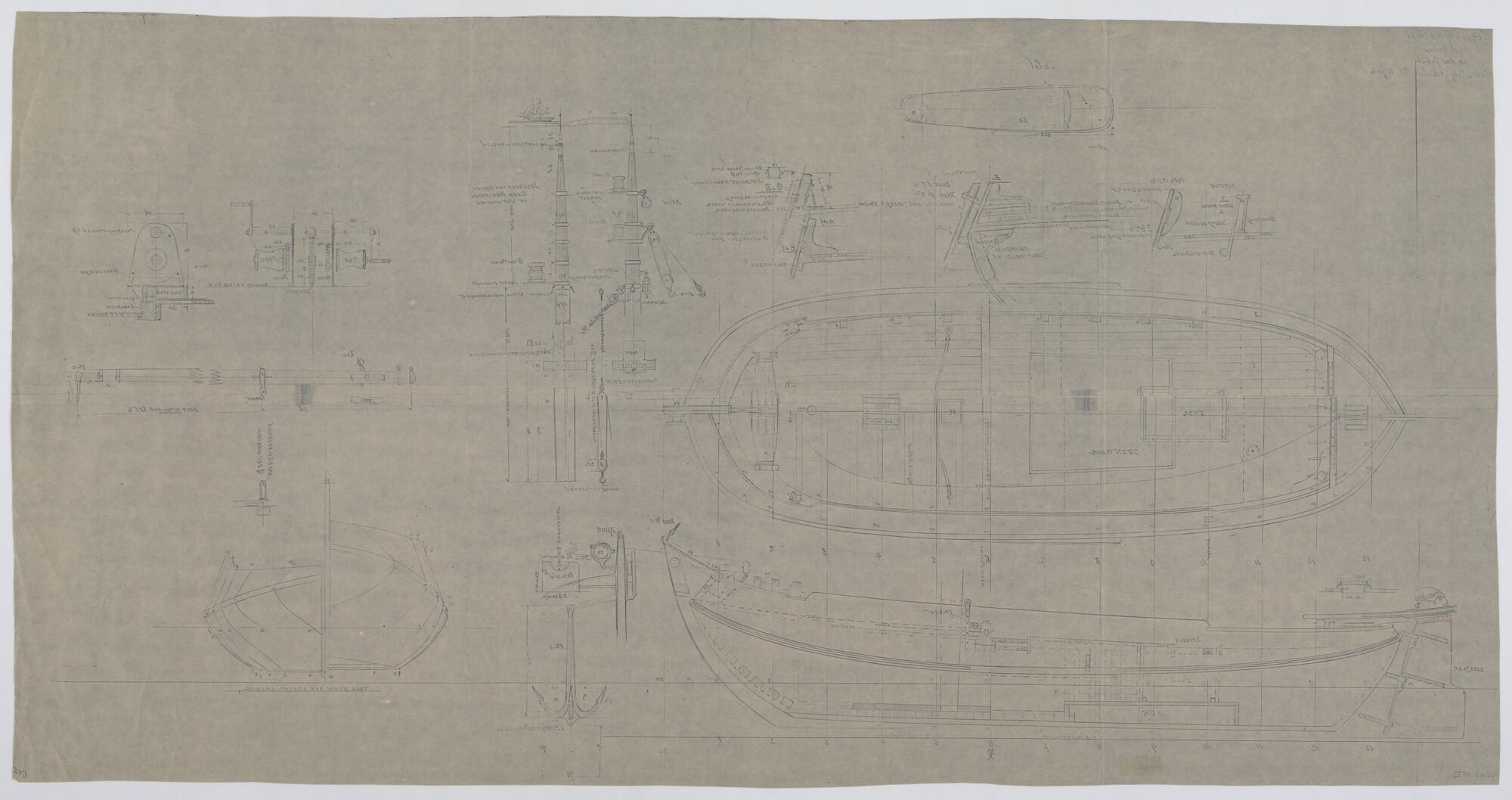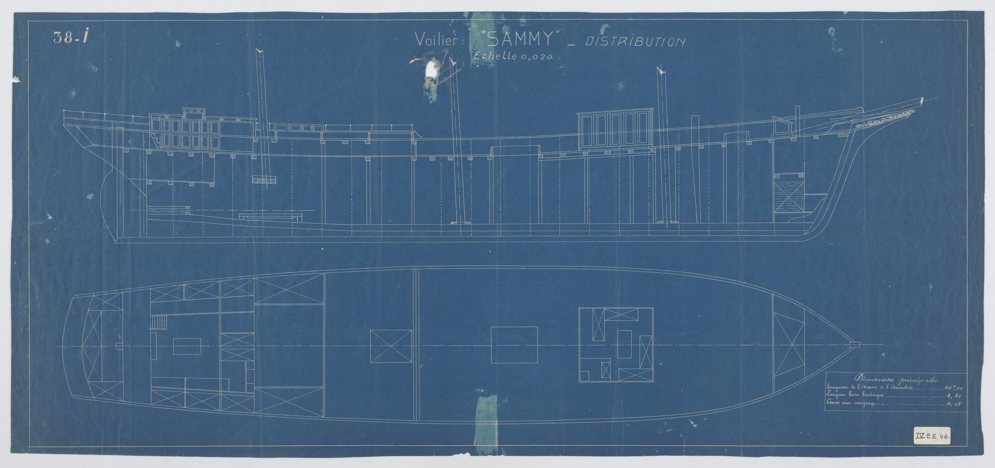 Zijaanzicht met tuigplan, lijnenplan, waterlijnen, s...