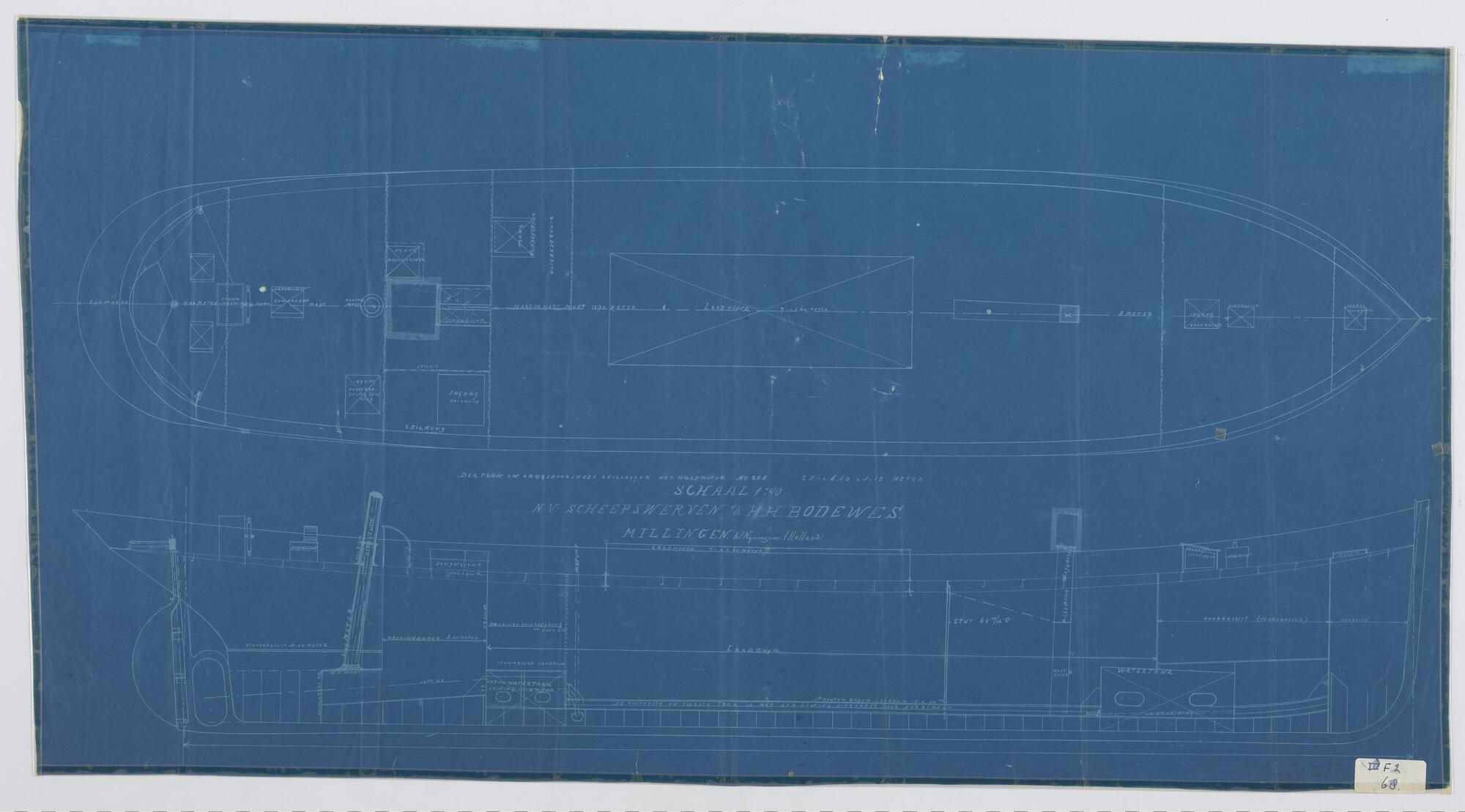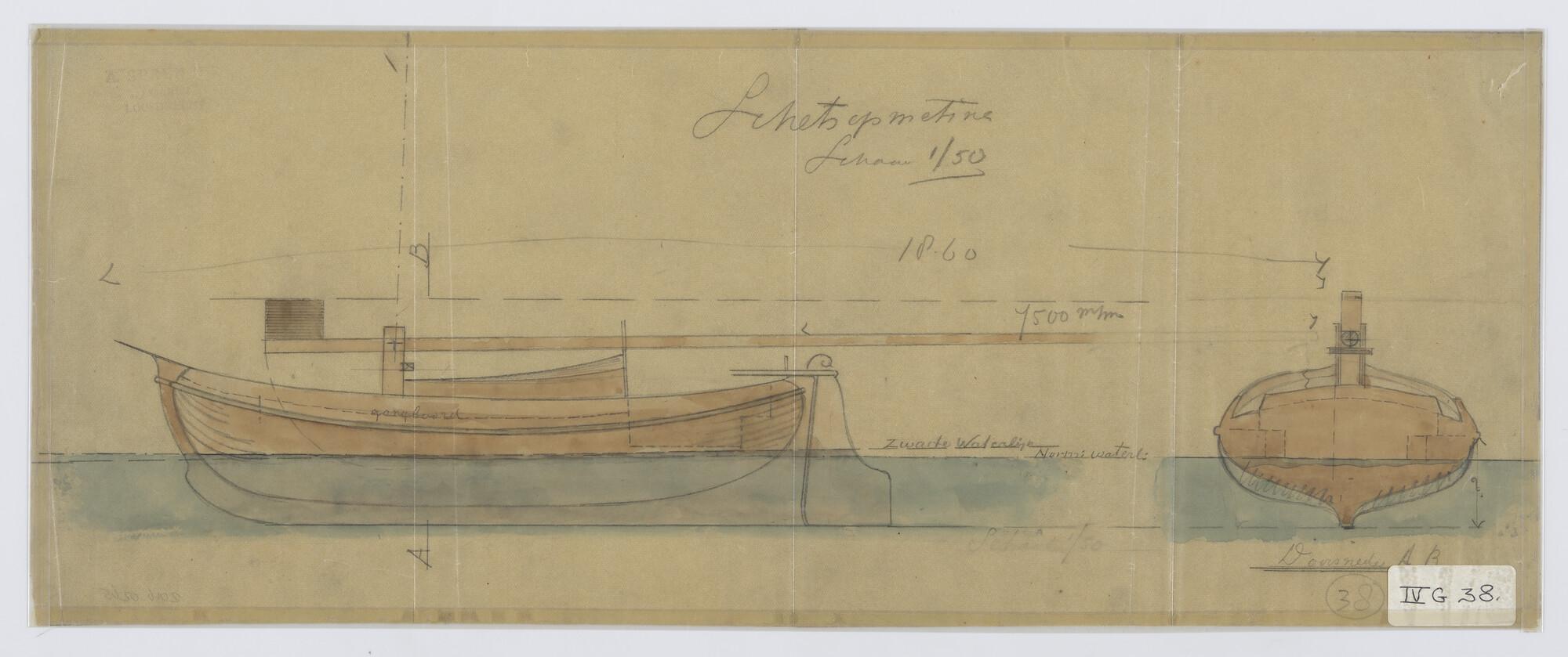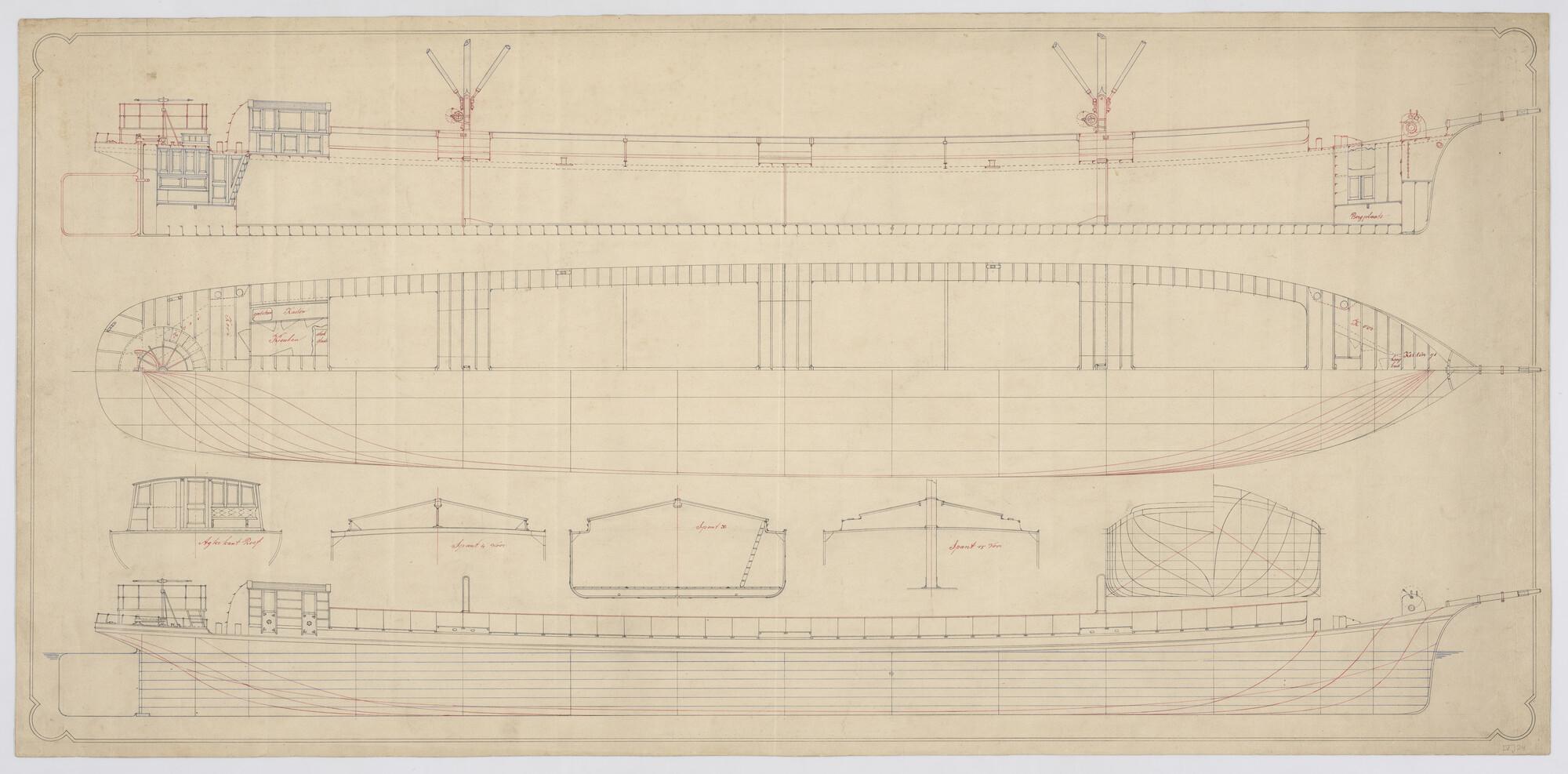 Verticale langsdoorsnede, zijaanzicht, waterlijnen, ...