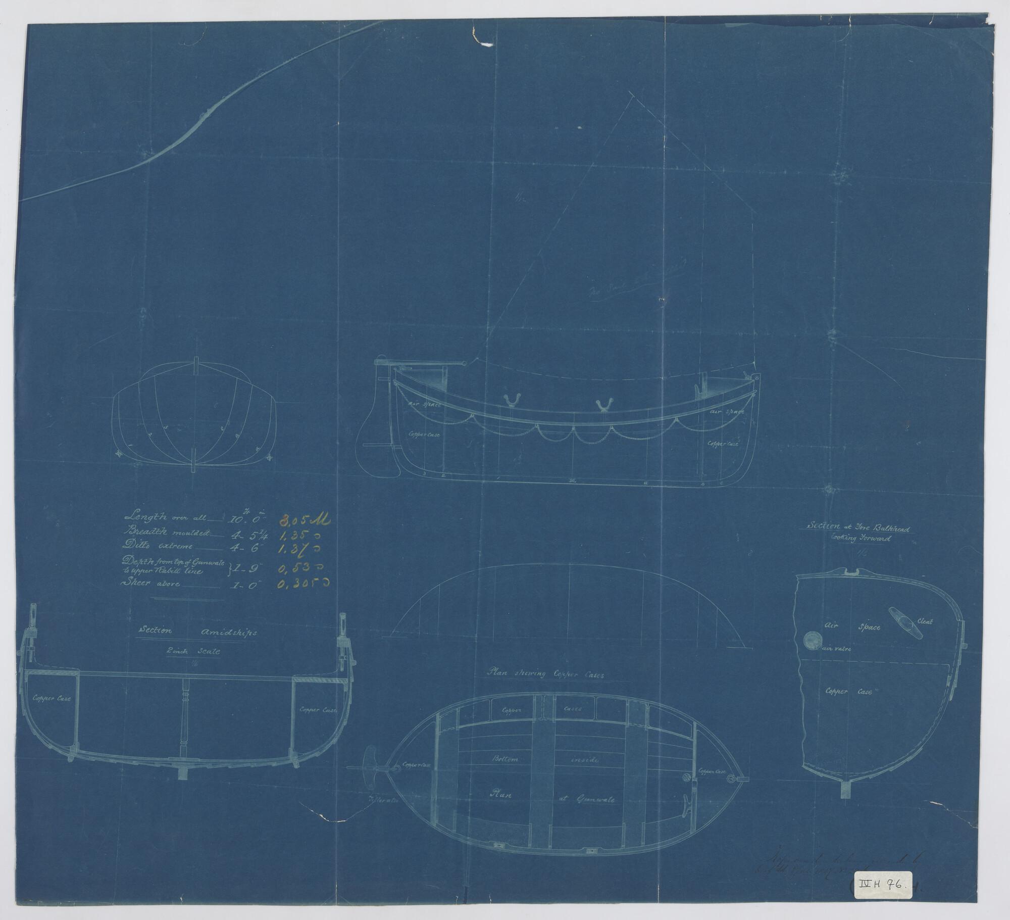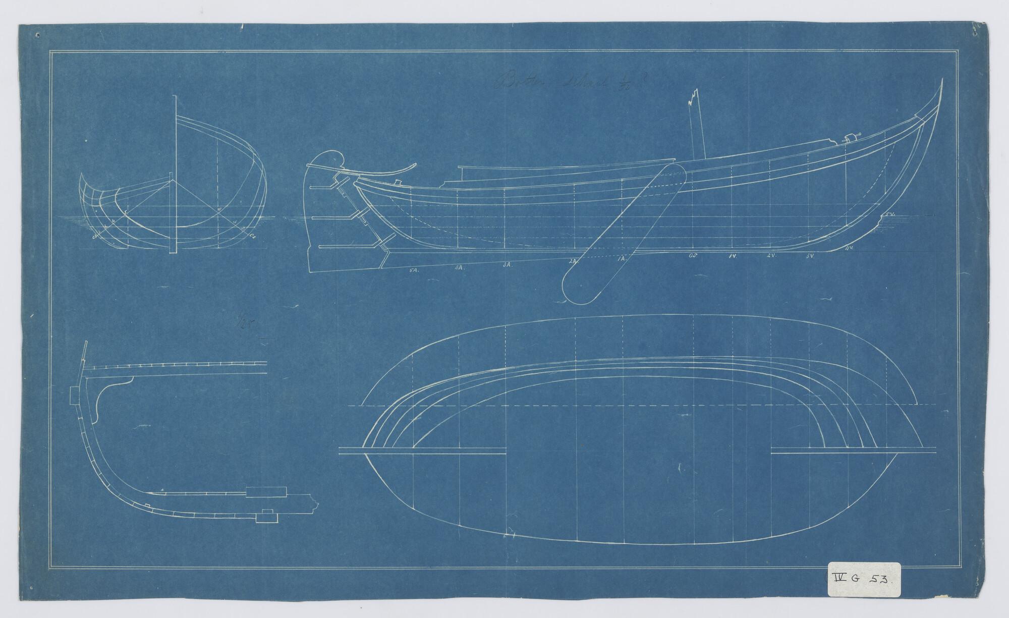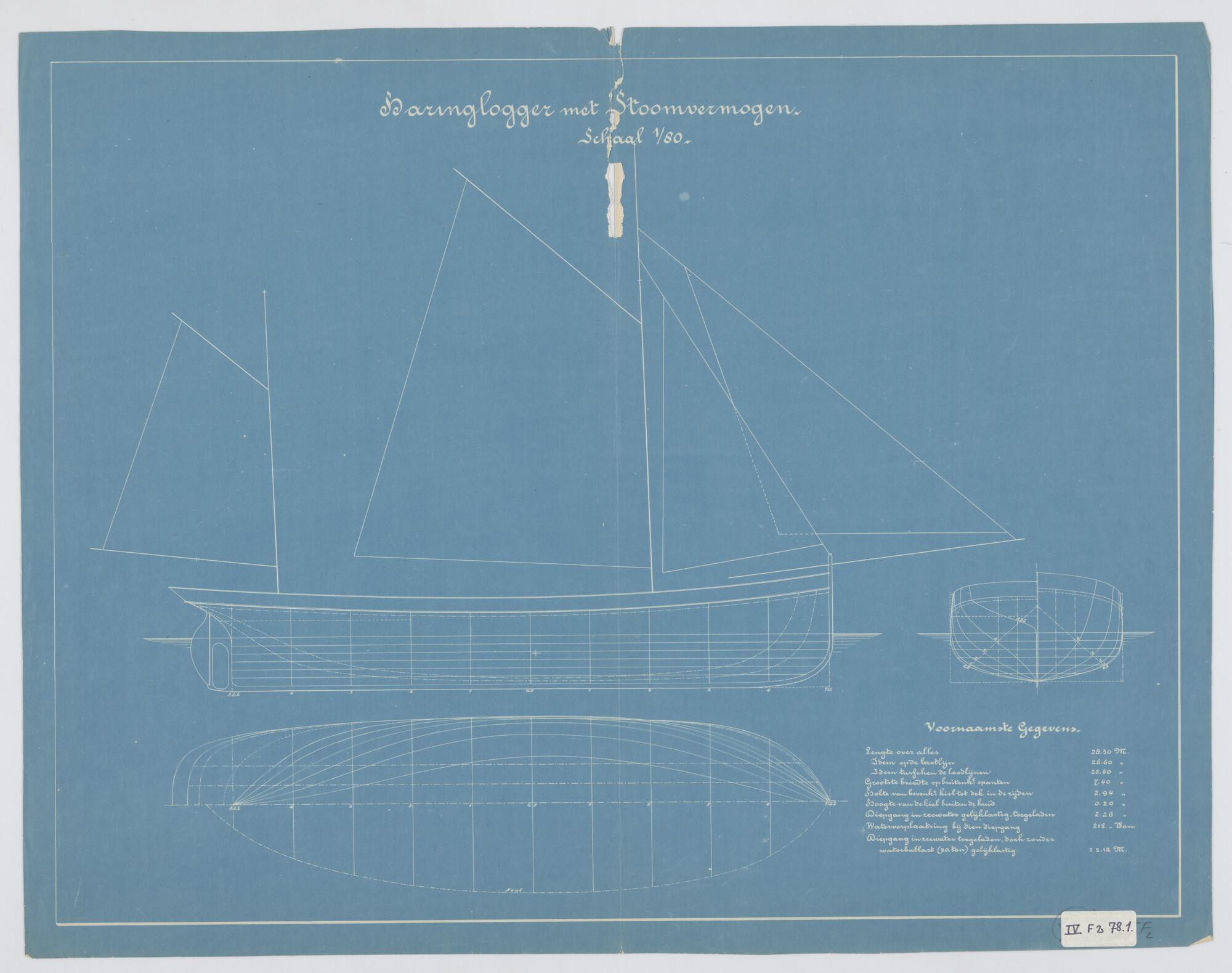 Zij-, boven-, voor- en achteraanzicht, waterlijnen v...