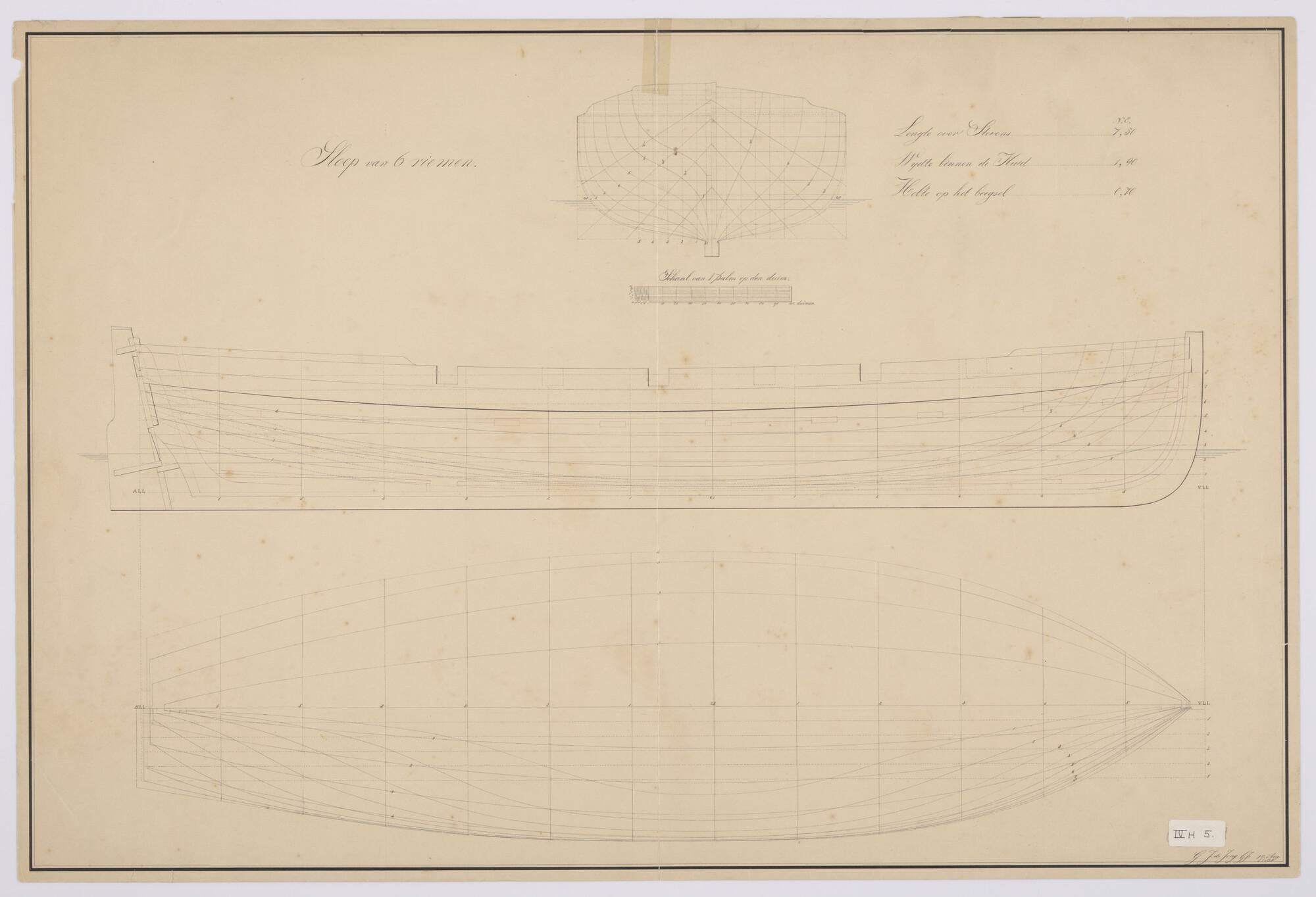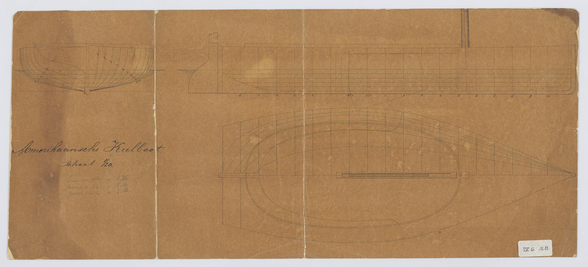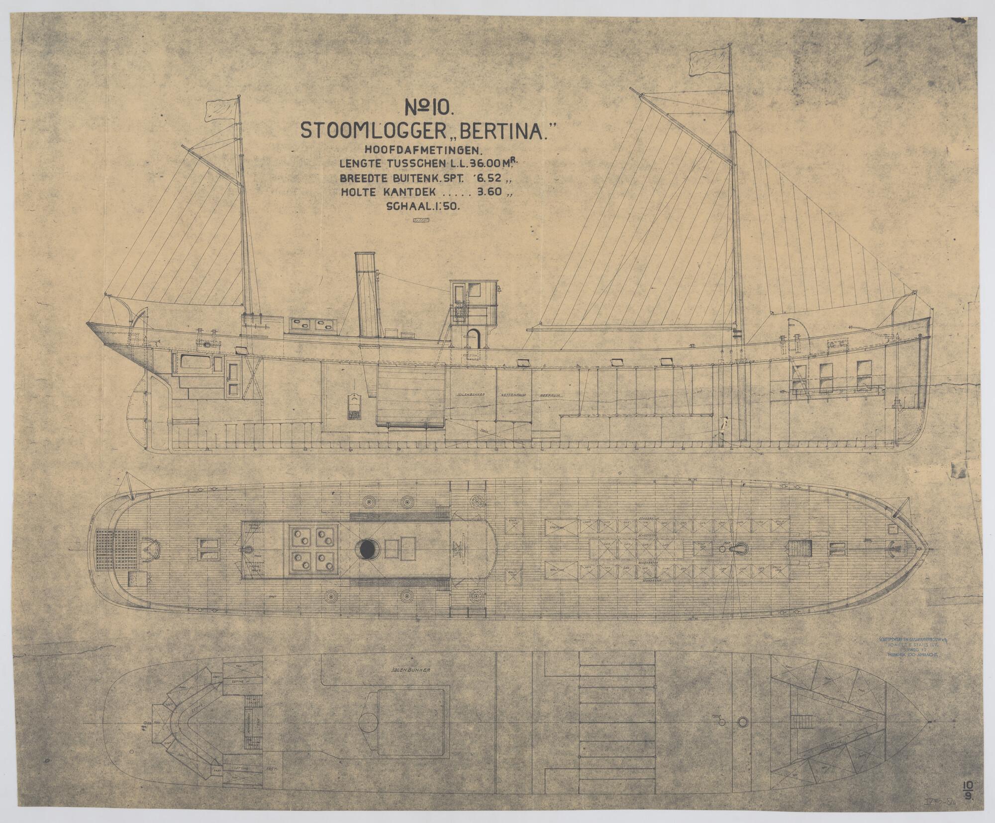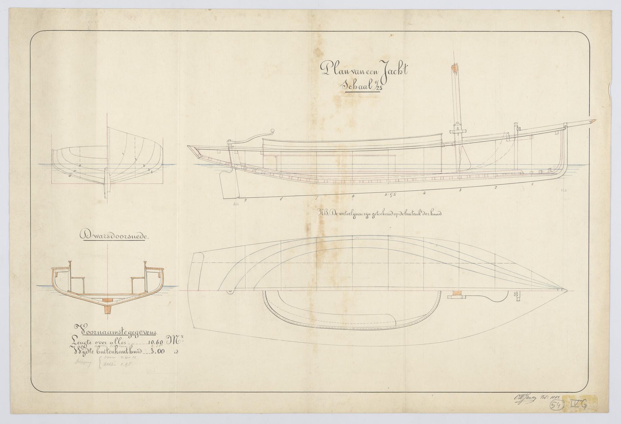 Verticale langsdoorsnede, lijnenplan en bovenaanzich...