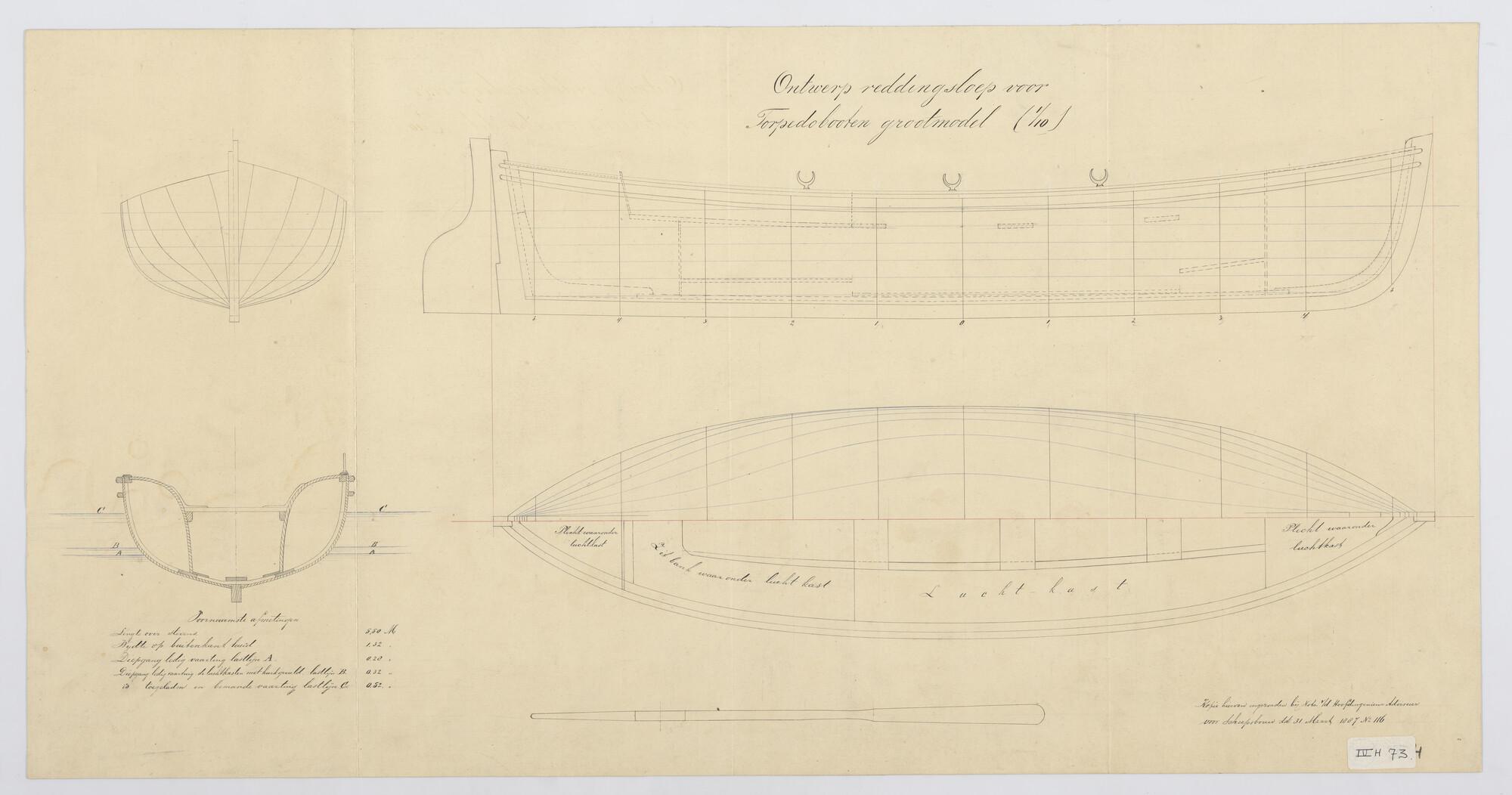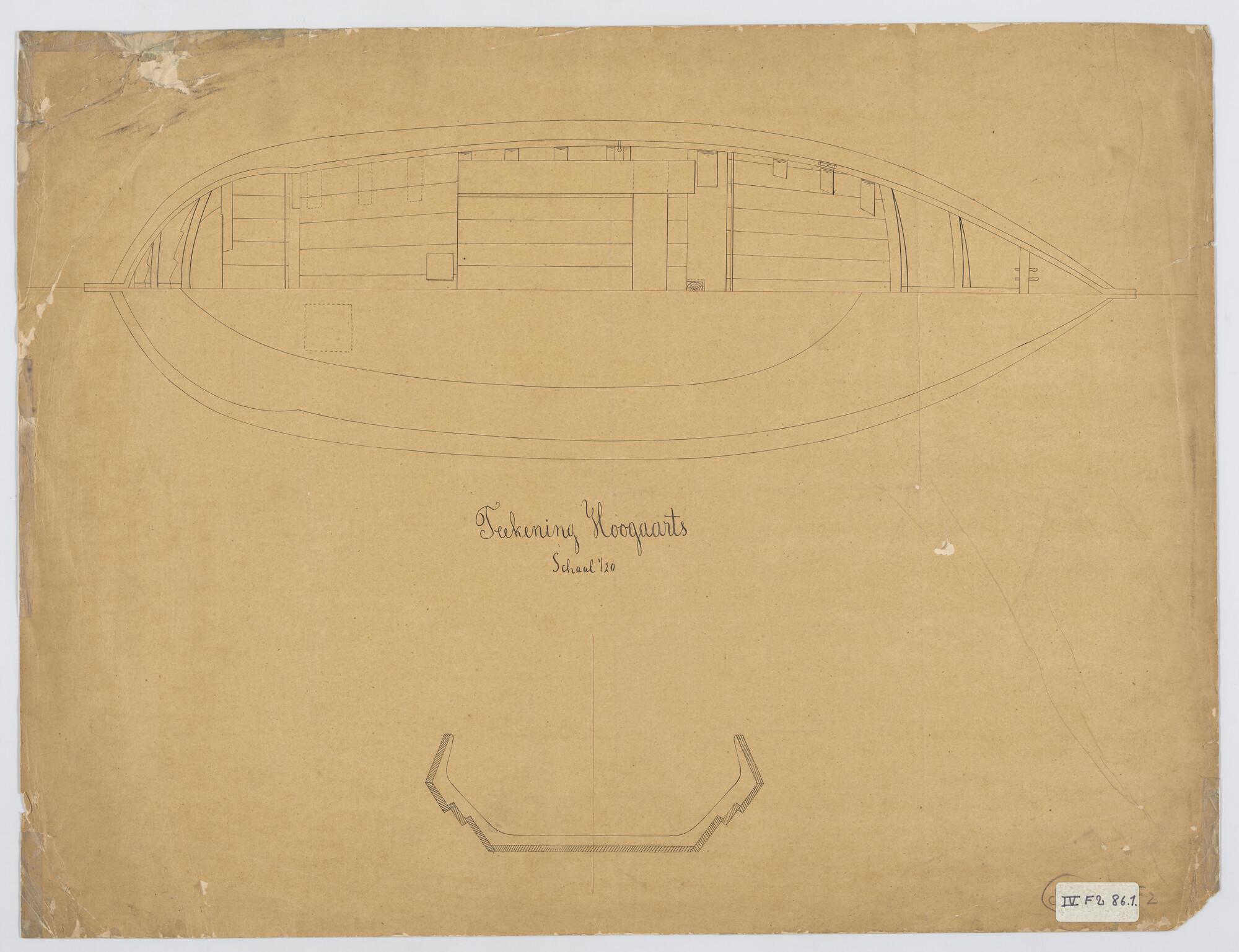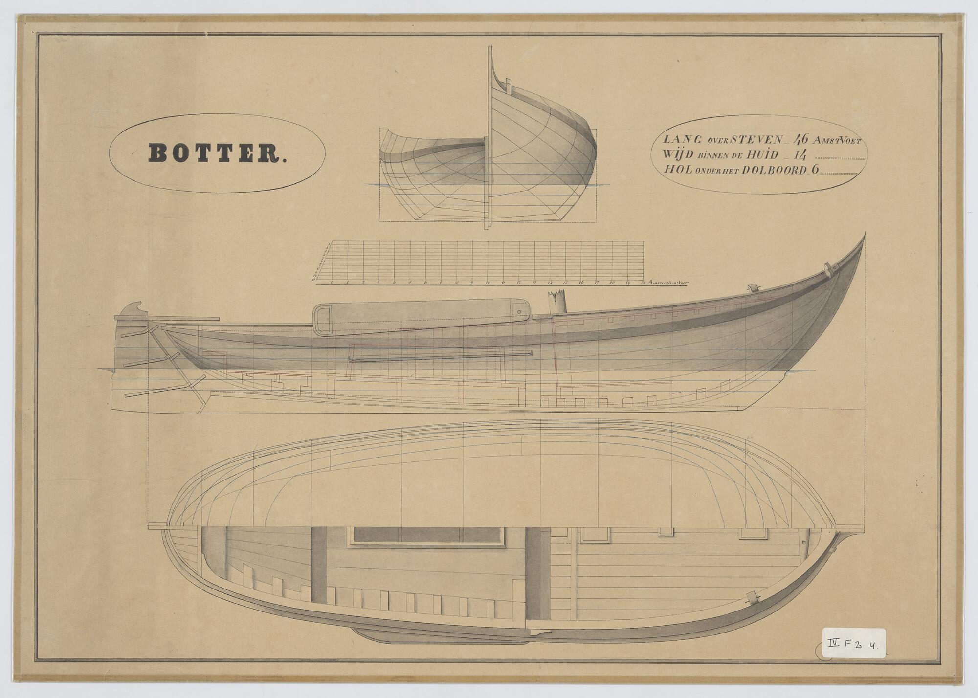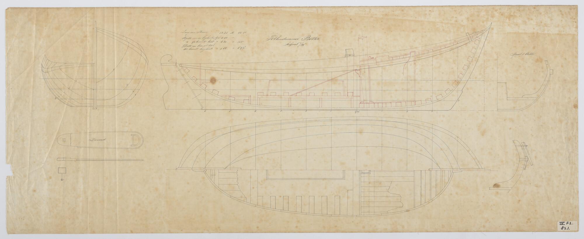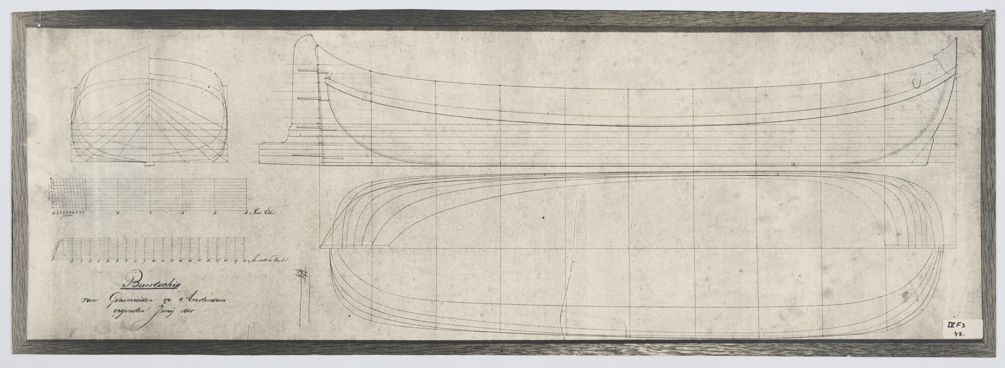 Verticale langsdoorsnede, lijnenplan en bovenaanzich...