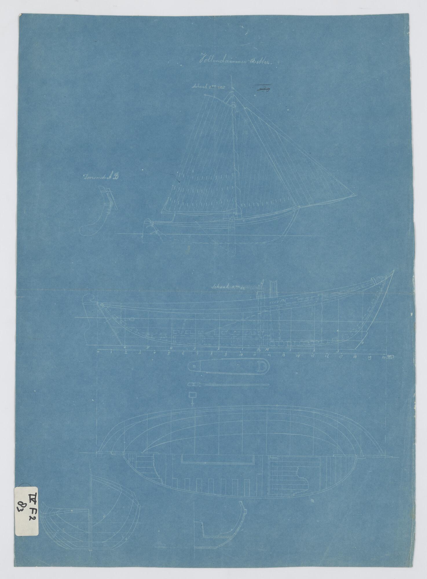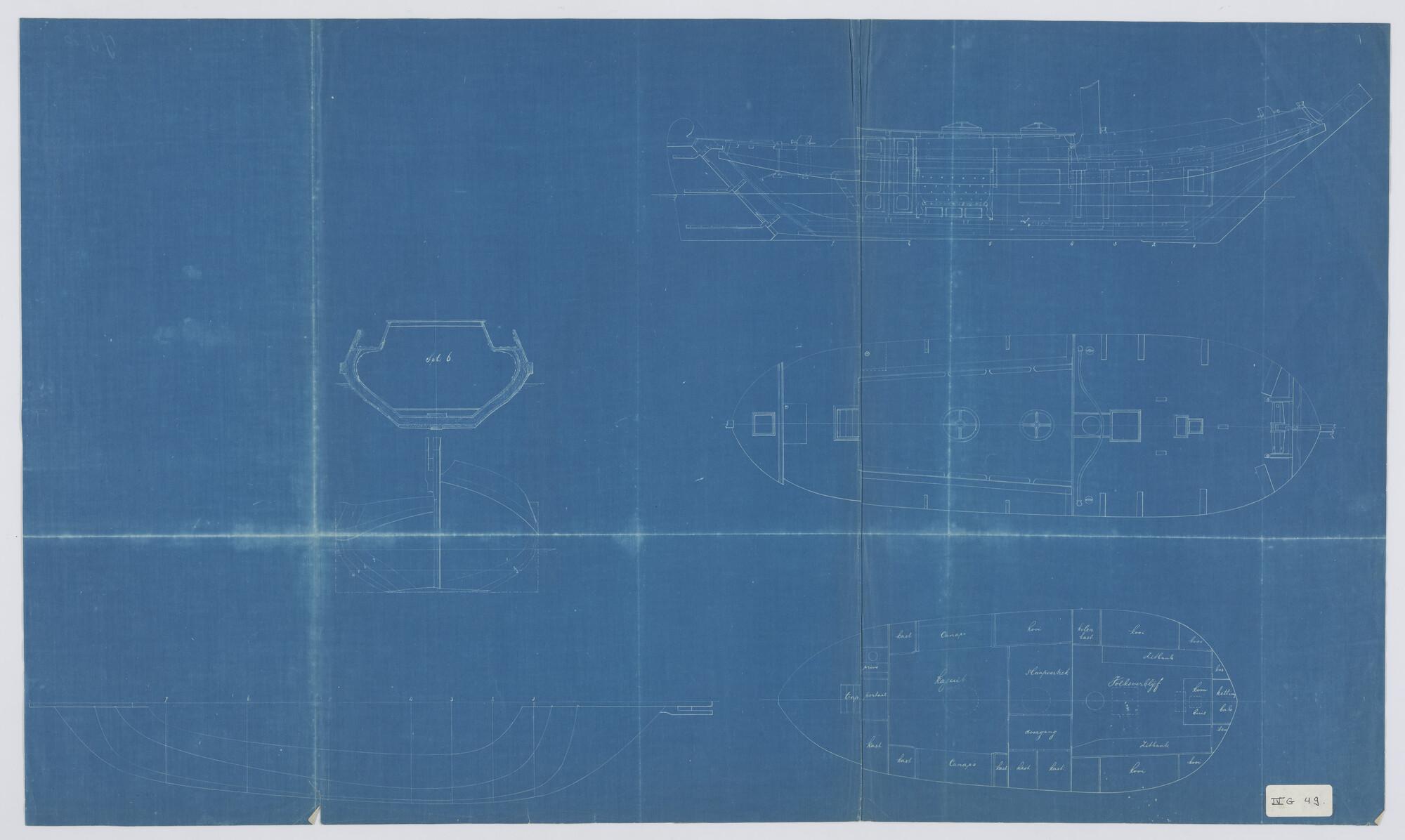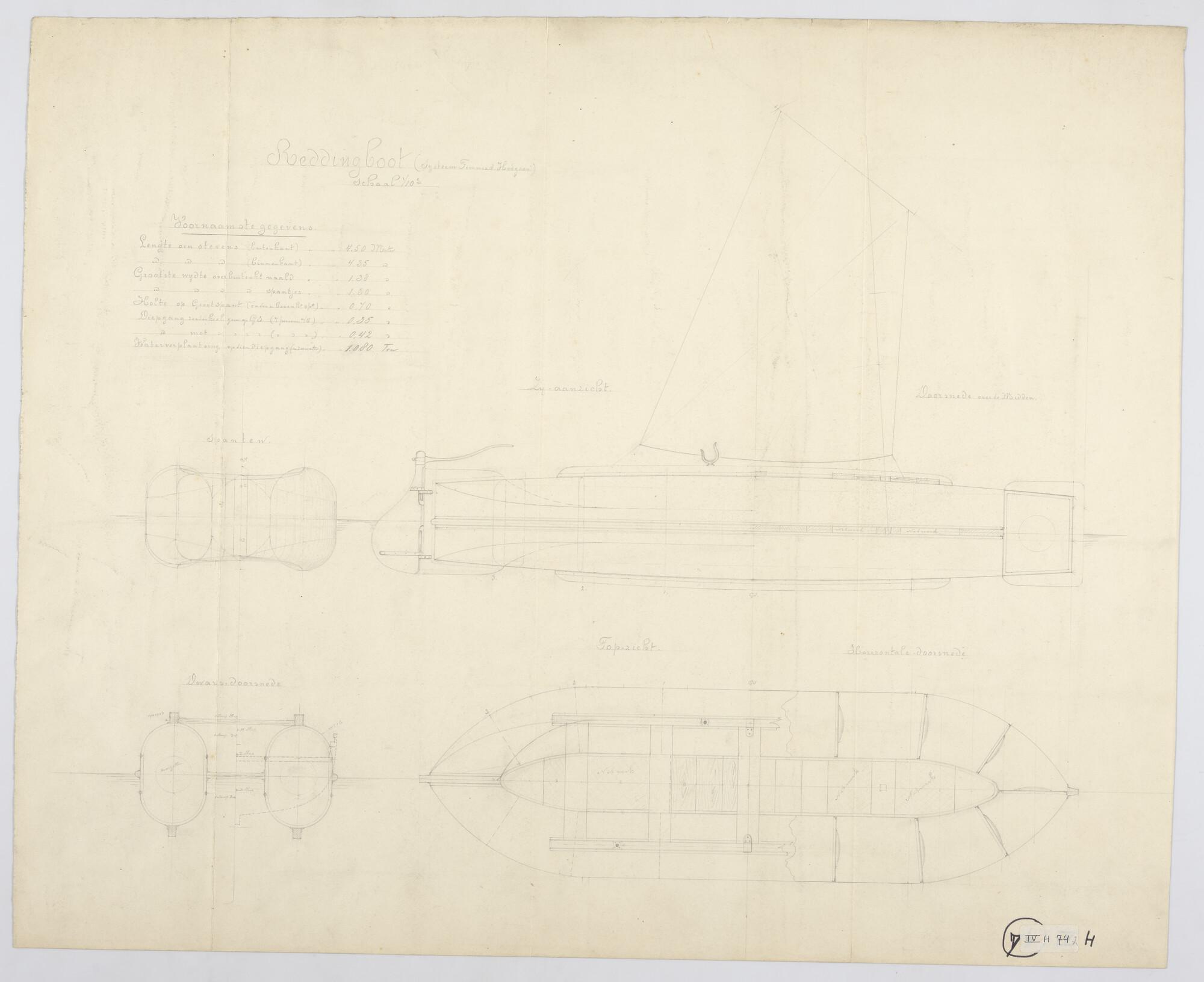 Zijaanzicht met midzwaard, bovenaanzicht, spantenraa...
