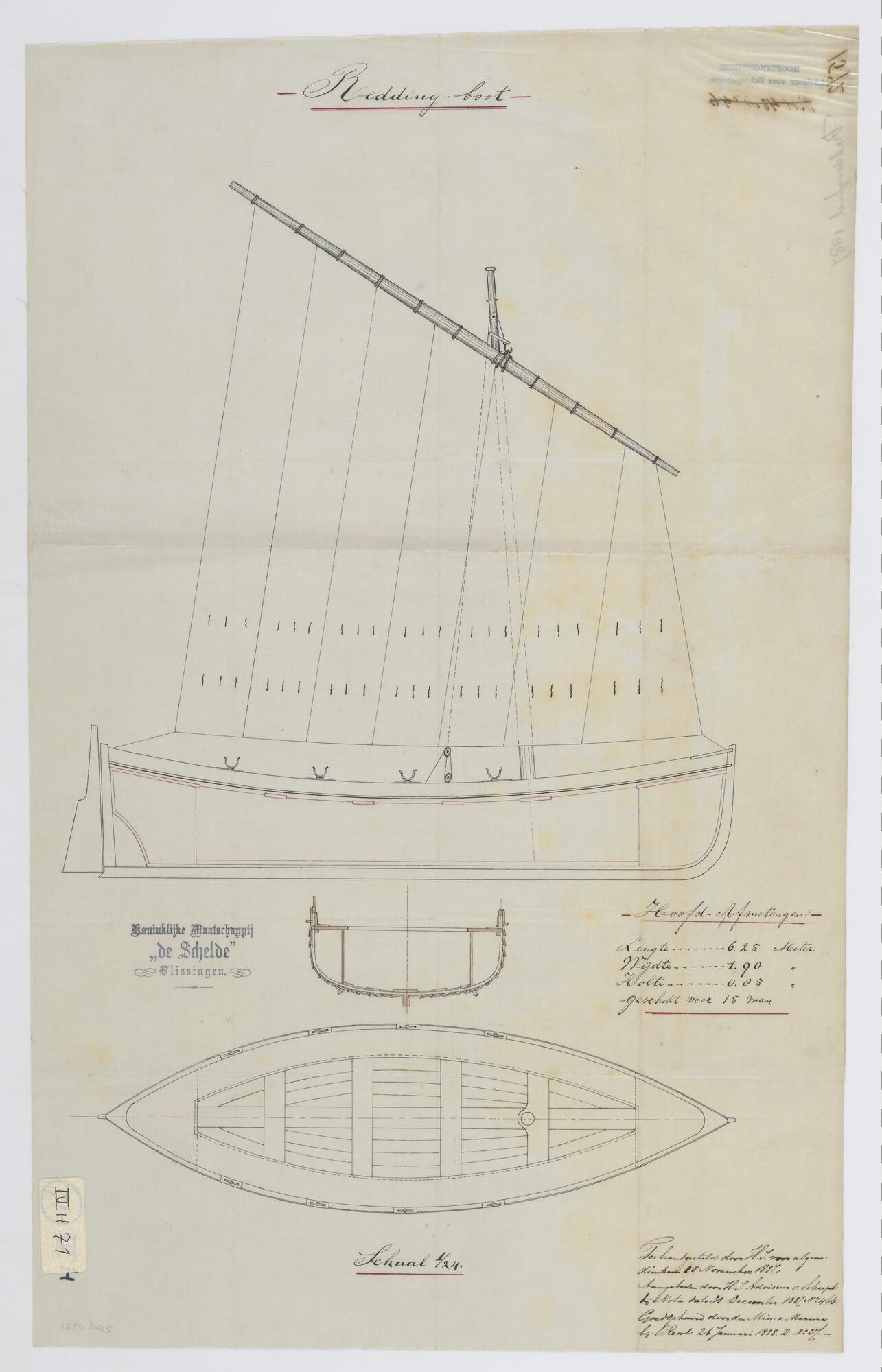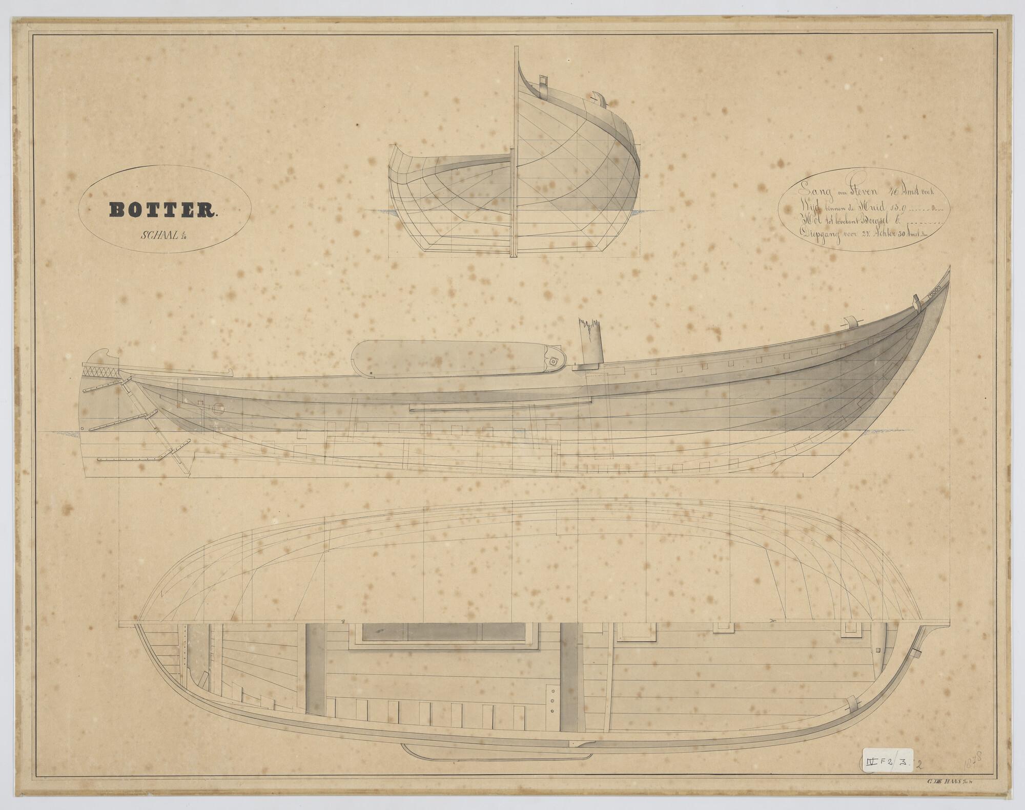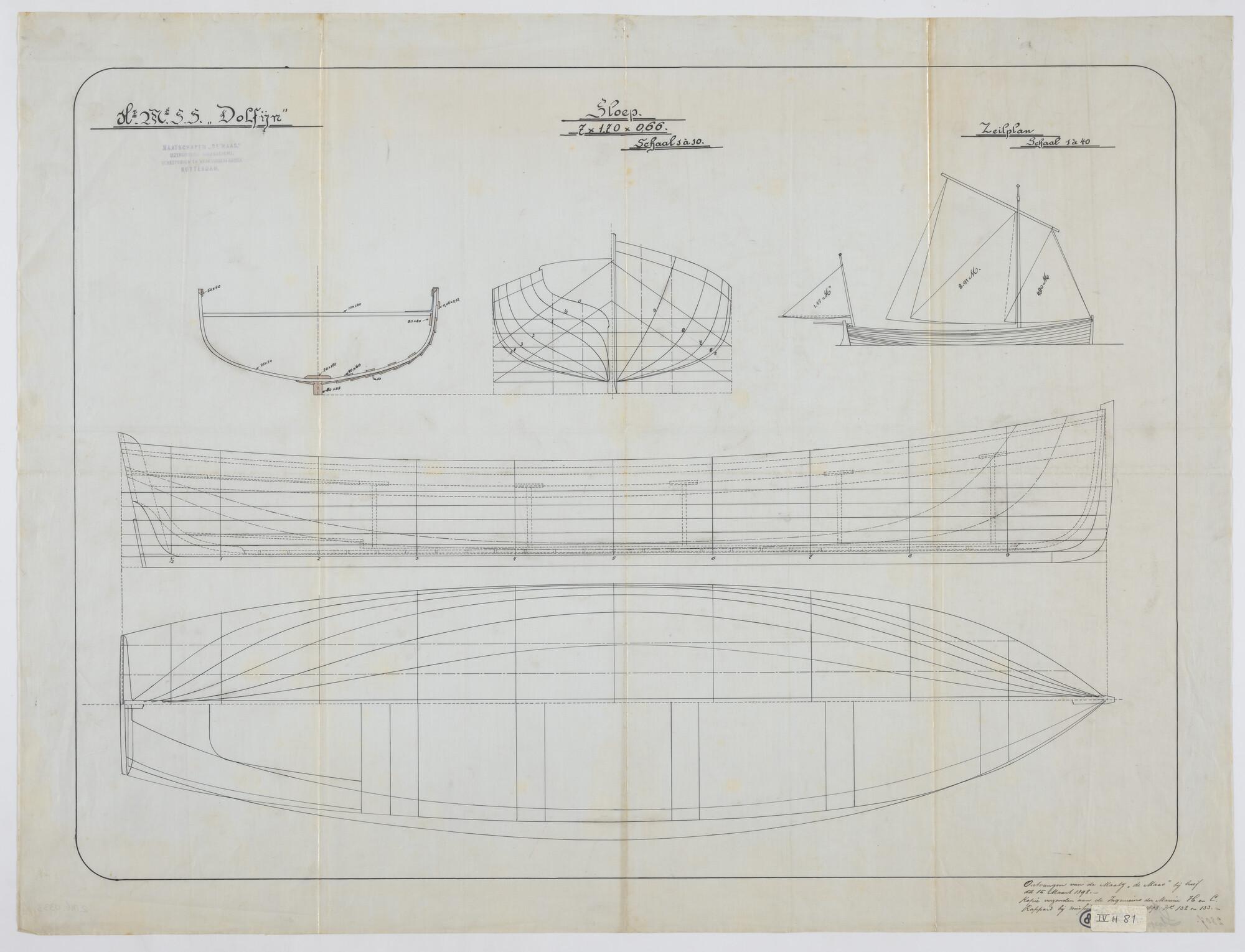 Zijaanzicht met midzwaard, bovenaanzicht, spantenraa...