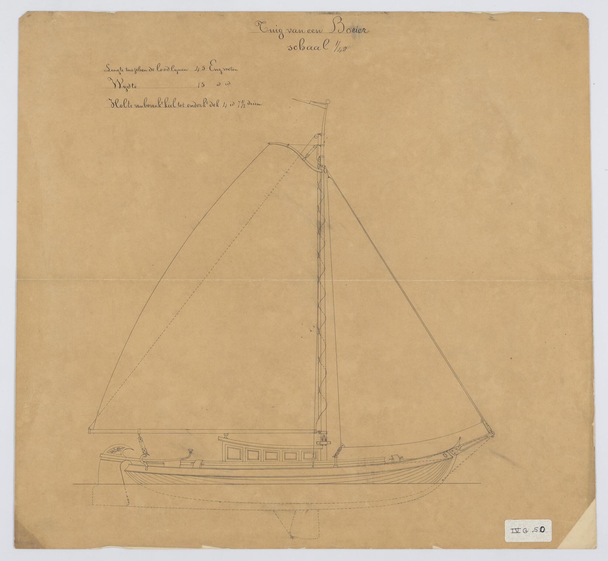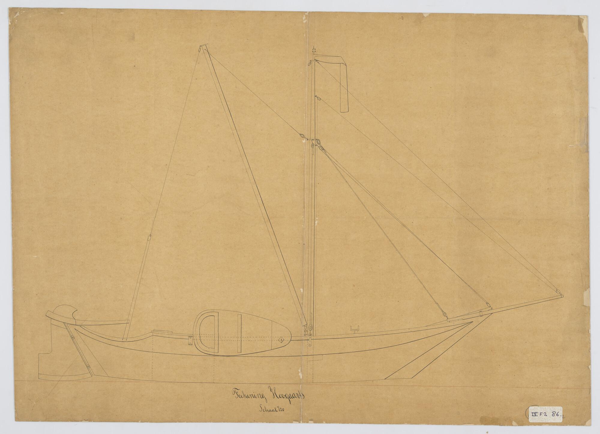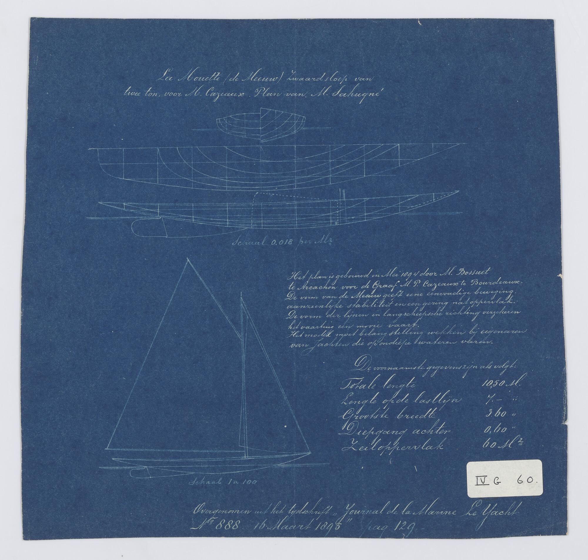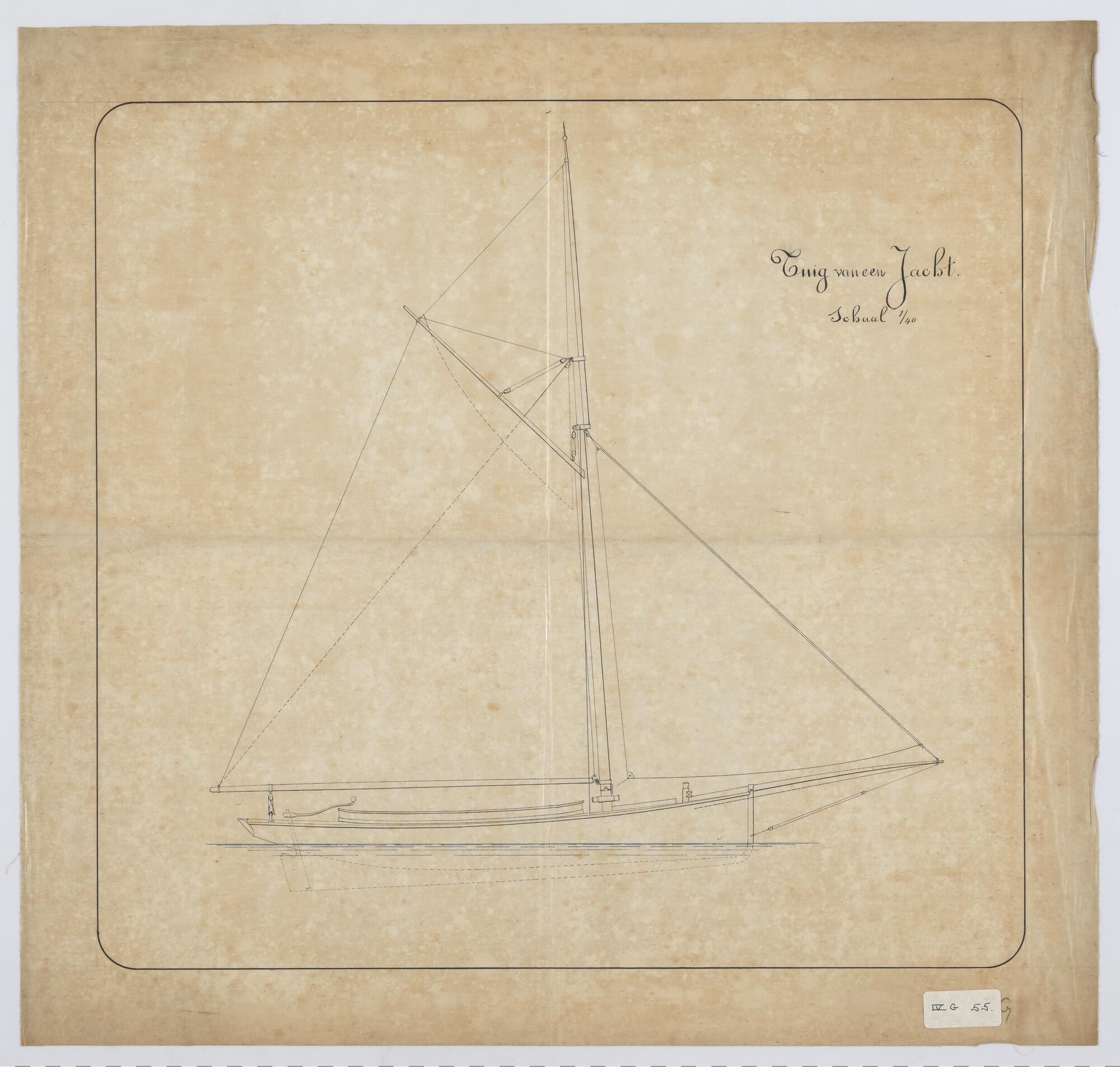 Zijaanzicht met tuigplan van een midzwaardjacht 1893
