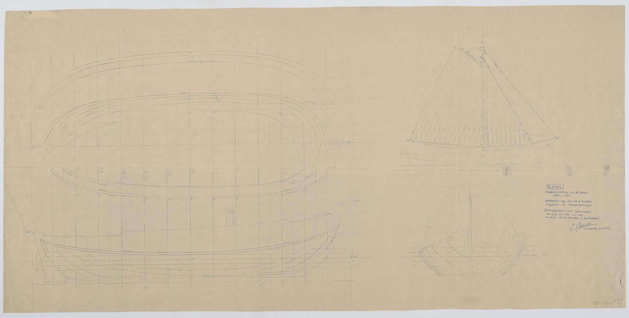 Blazer: Zijaanzicht met tuigplan, waterlijnen, verti...
