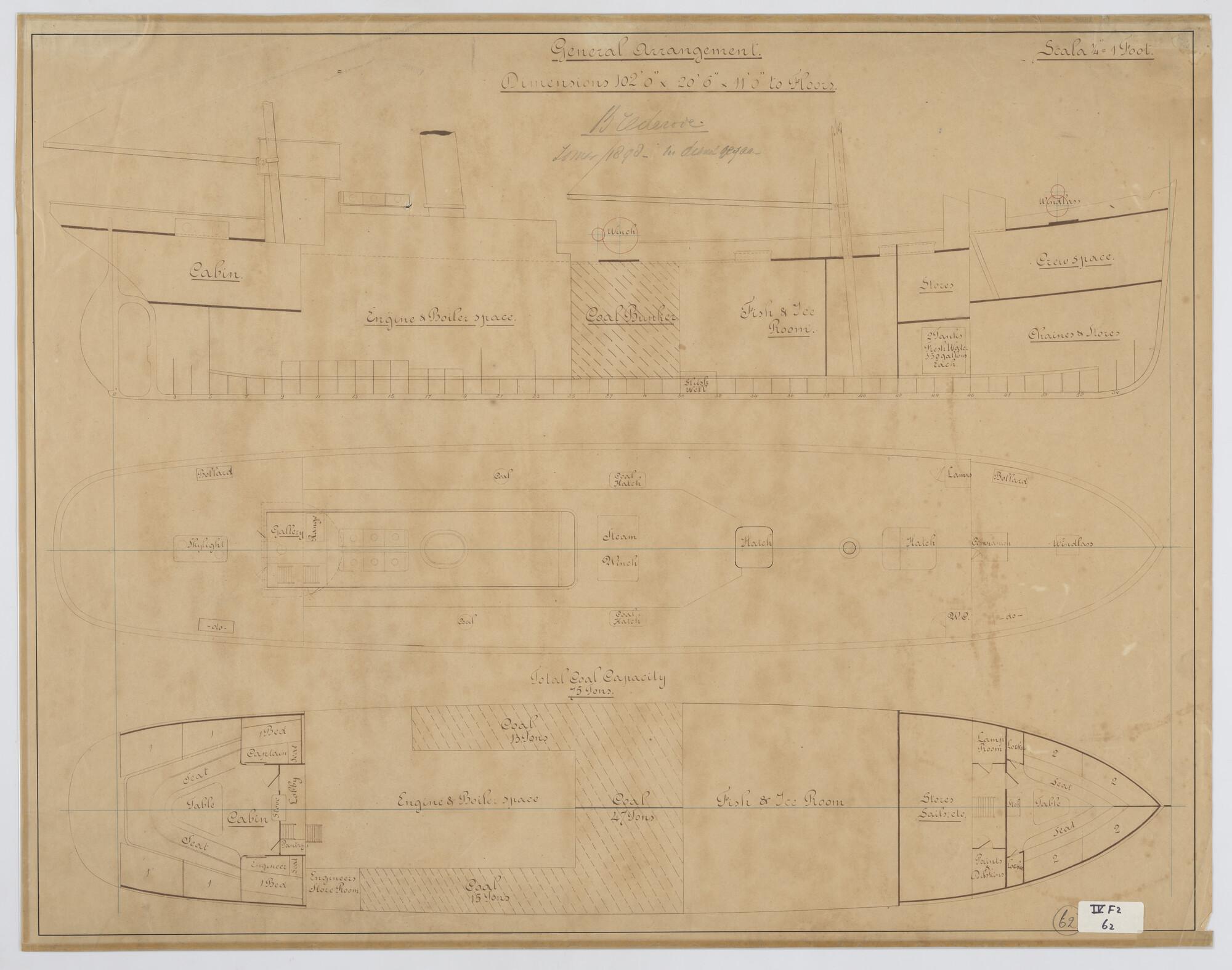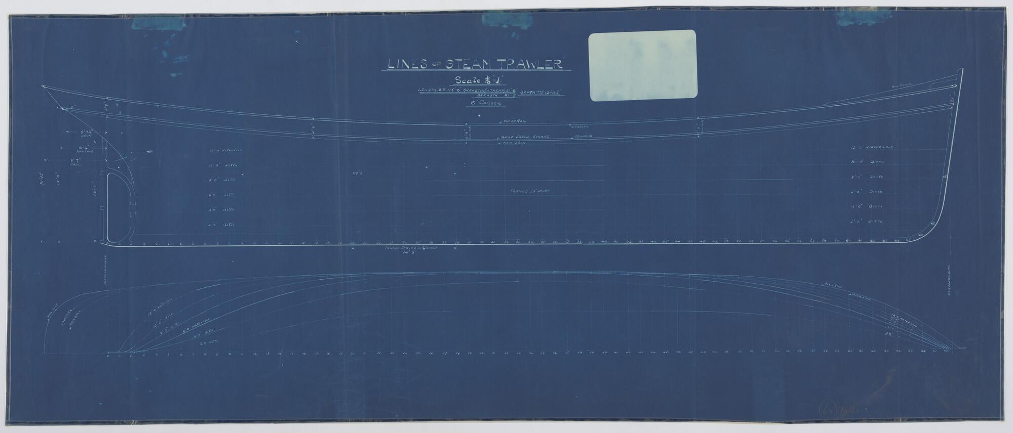 Zijaanzicht, waterlijnen, Stoomtrawler