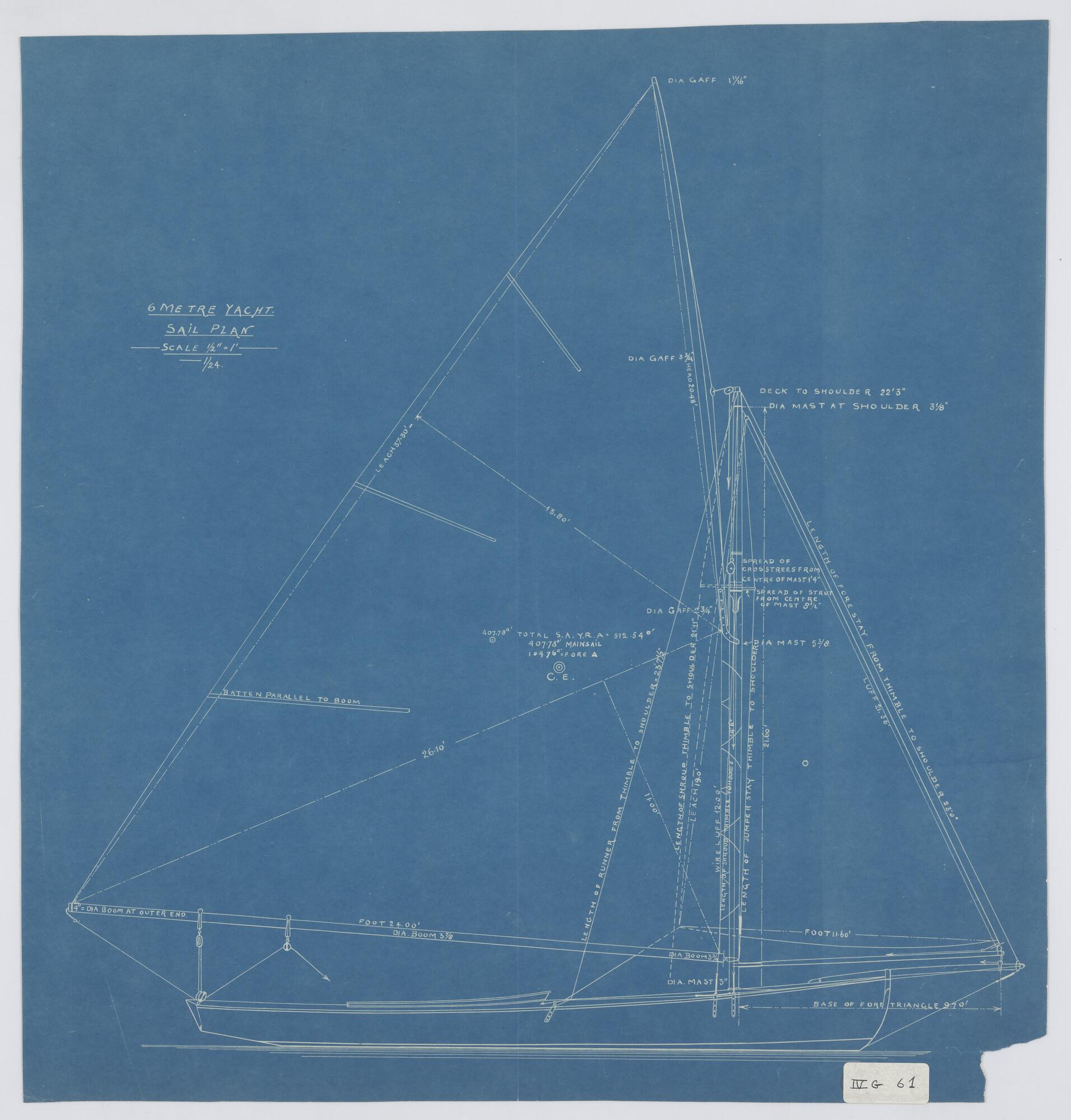 Zijaanzicht met tuigplan van een zes meter jacht