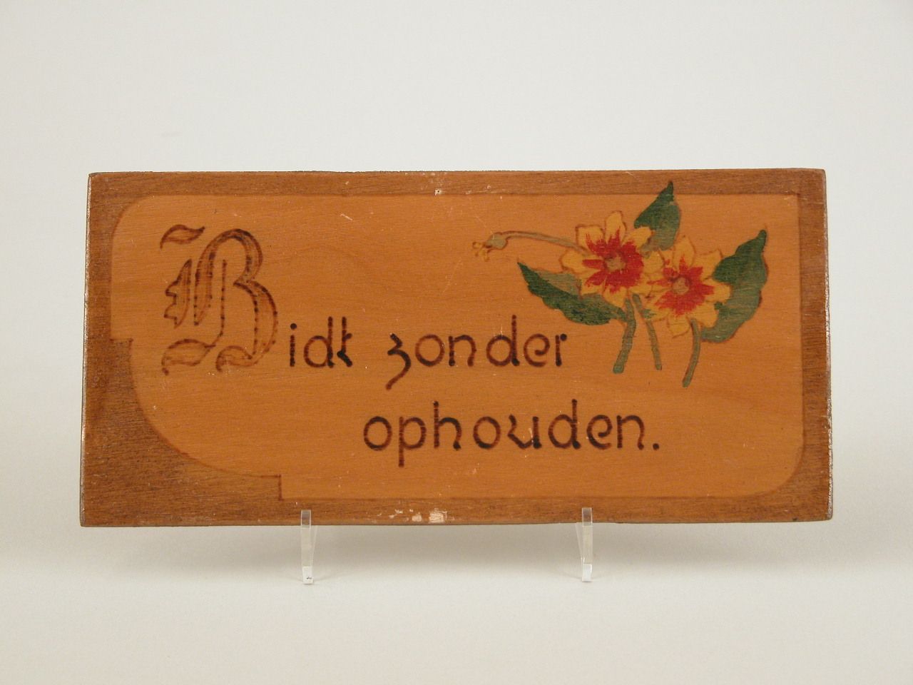 Tekstbord met "Plicht gaat boven genot" (voorzijde) ...