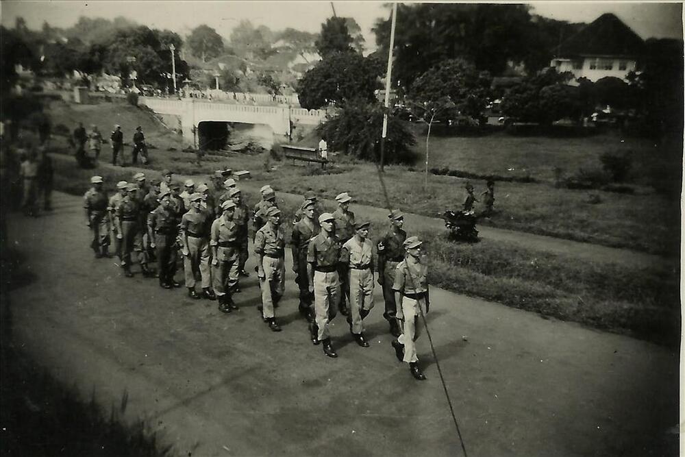 Nederlands Indië; militair, peloton, marcheren, brug...