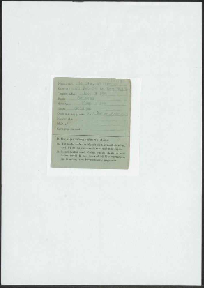 Identiteitskaart op naam van de Bie, Willem C.