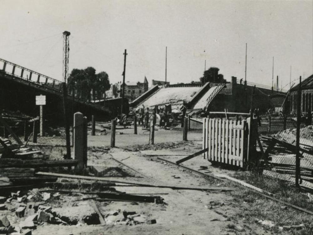 Nijmegen, opgeblazen brug over spoorwegemplacement i...