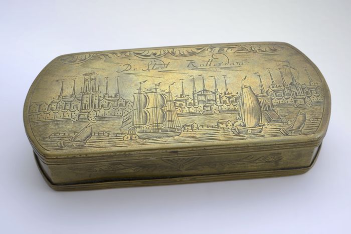 Koperen tabaksdoos met gegraveerde voorstelling: sta...