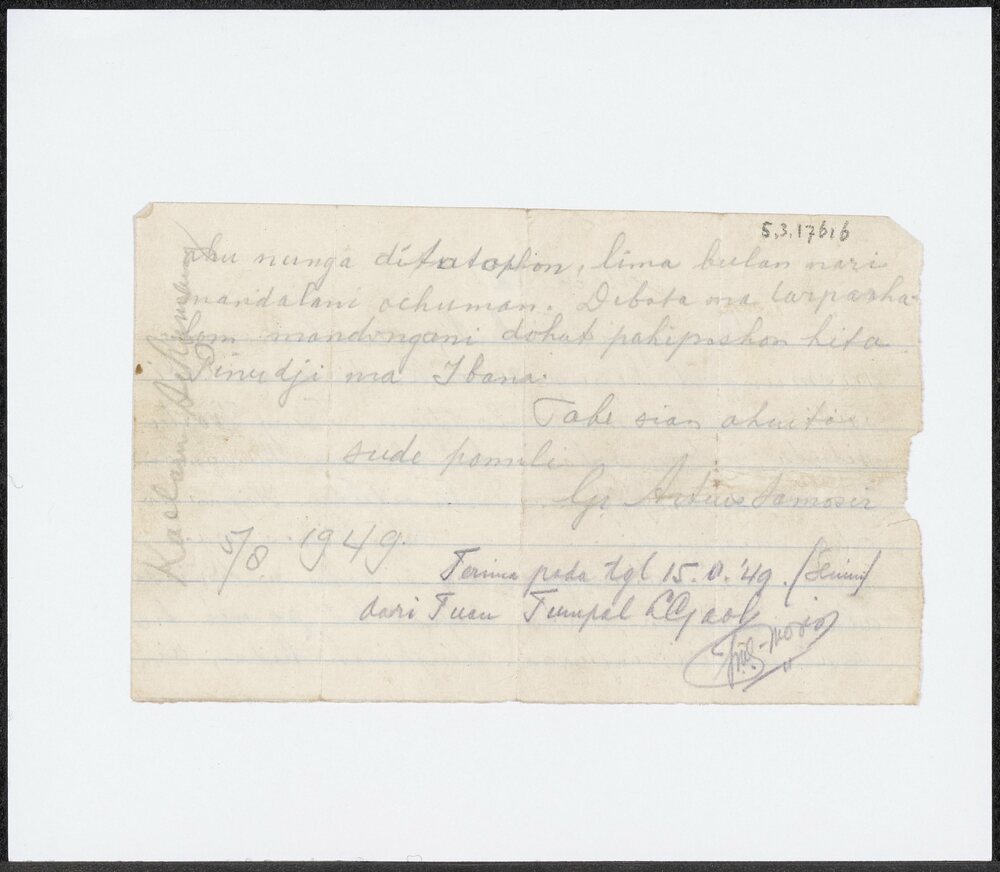 Handgeschreven briefje in het maleis van de T.N.I., ...