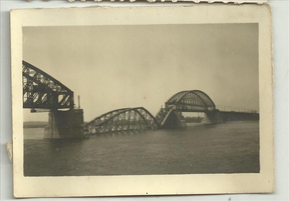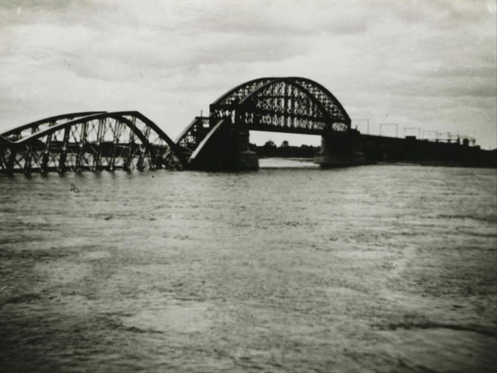 Foto opgeblazen spoorbrug te Nijmegen, 1940.