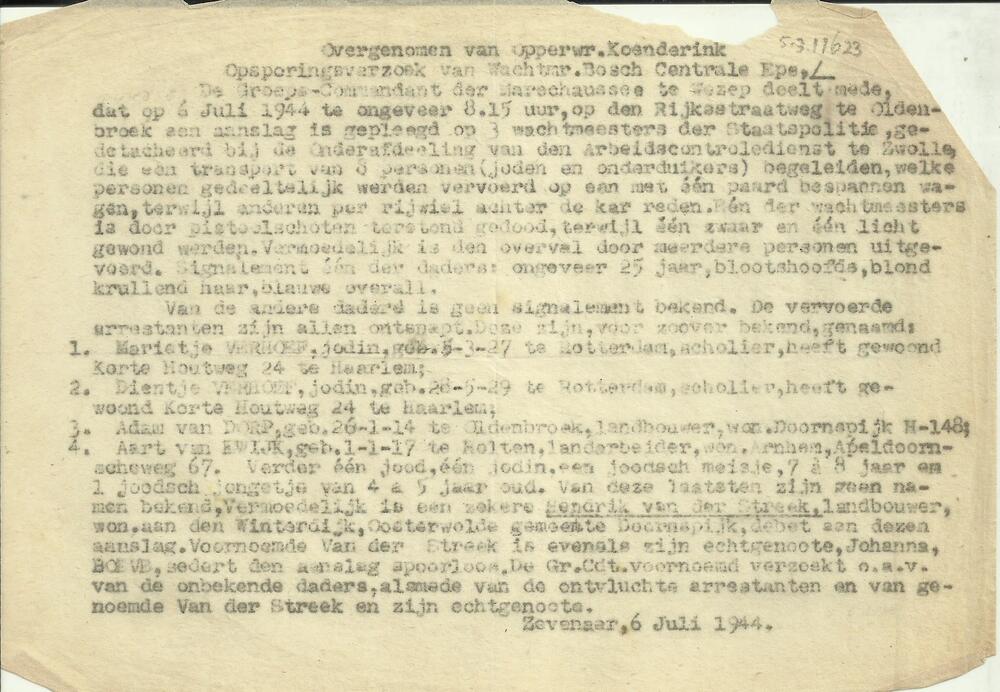 Alarmeringsbericht, 6 juli 1944, betreffende aanslag...