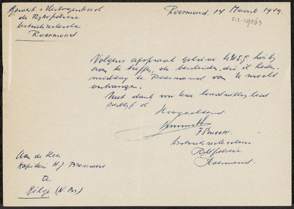 Brief van F. Smeets van de Rijkspolitie Roermond aan...