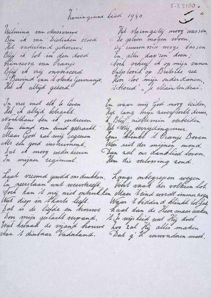 Kopie, vel met tekst gedicht "Koninginnelied 1940" (...