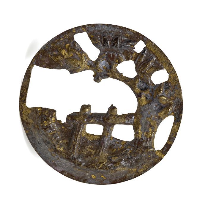 Rond opengewerkt plaatje met in reliëf landschapsvoo...