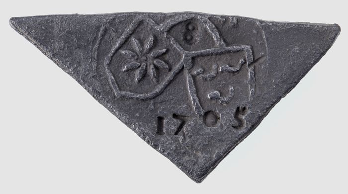 Driehoekig plaatje lood met wapenschilden en "1705"
