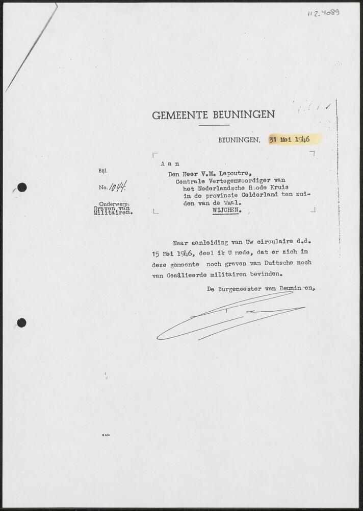 Brief van de Gemeente Beuningen, 31 mei 1946.