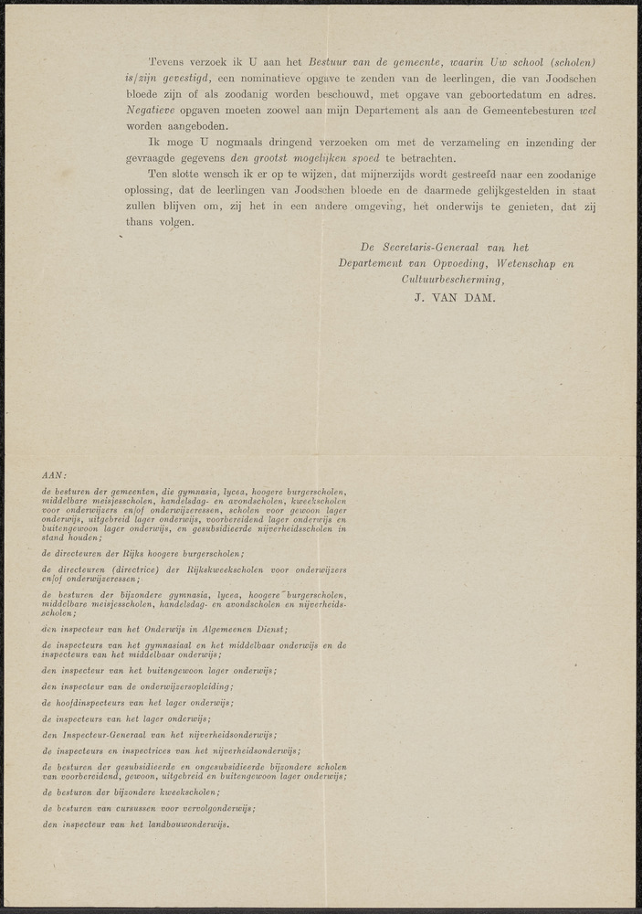 Brief van het Departement van Opvoeding, Wetenschap ...