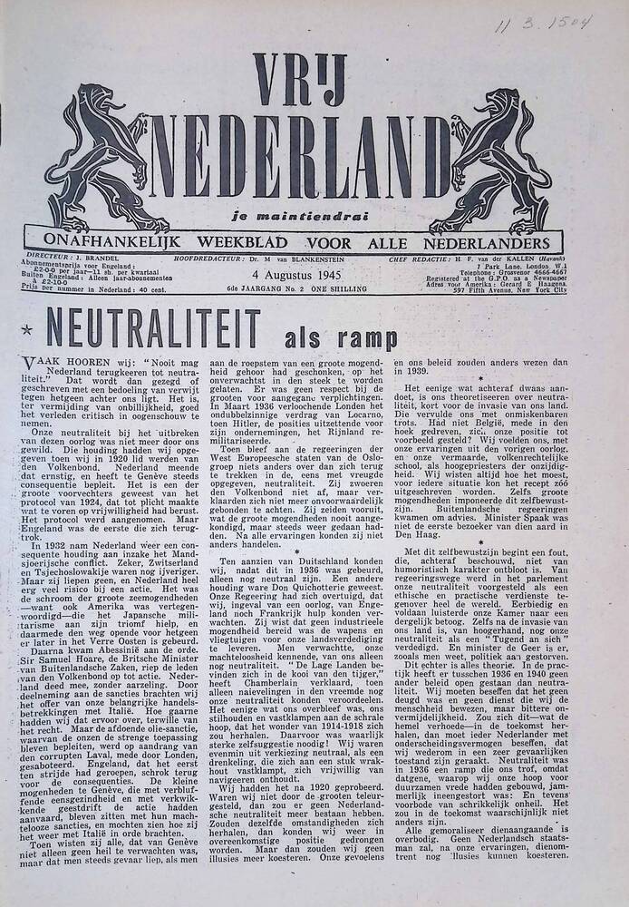De Nieuwe Amsterdammer ( omslag ) No 76, 16 April 1945