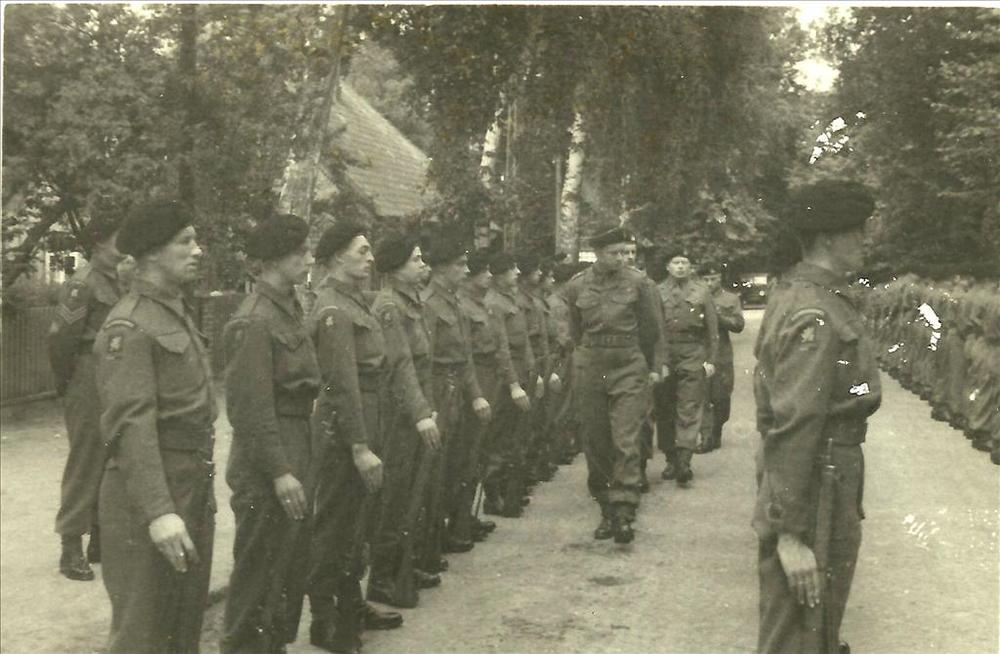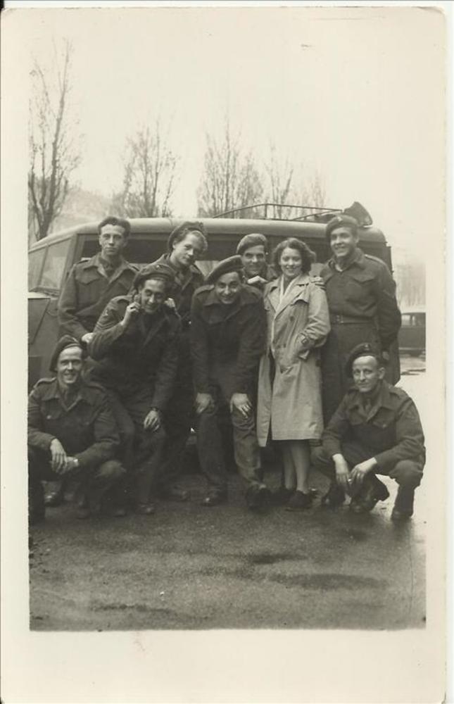 Groepsportret 8 soldaten en een vrouw in burger