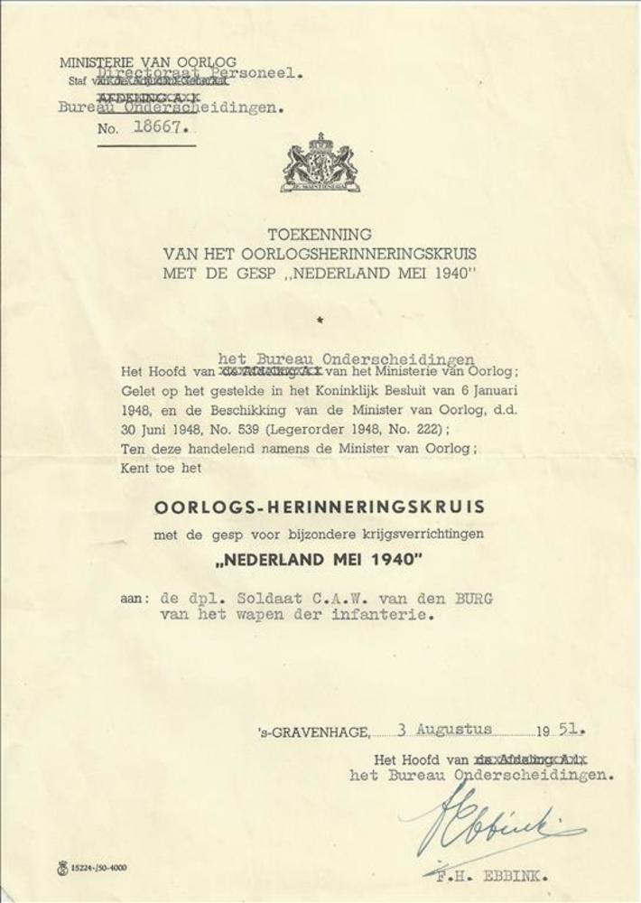 Certificaat Het Oorlogsherinneringskruis met de gesp...