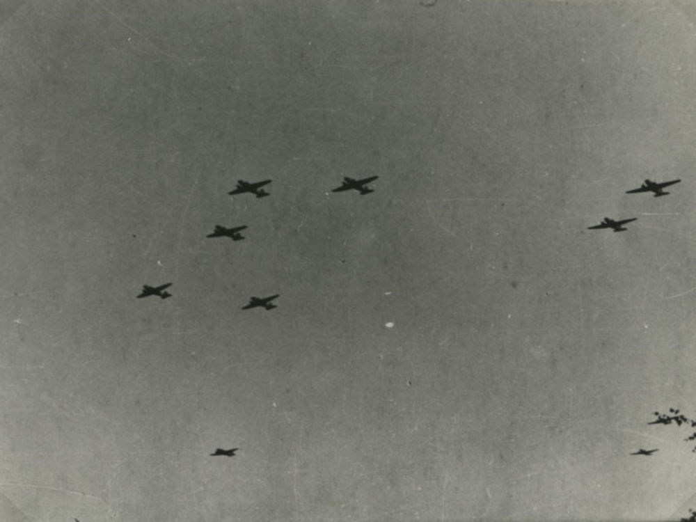 Foto van formatie C-47 Dakota's van onder gezien.