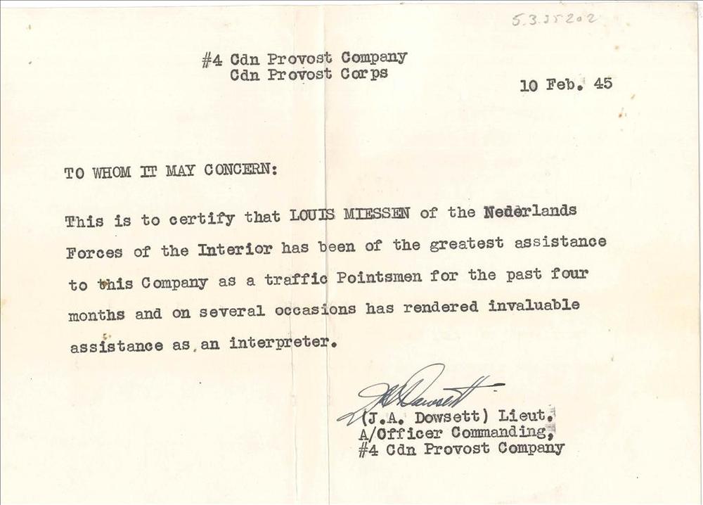 Getuigschrift op naam van L. Miessen