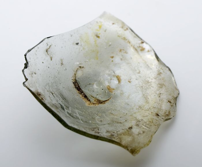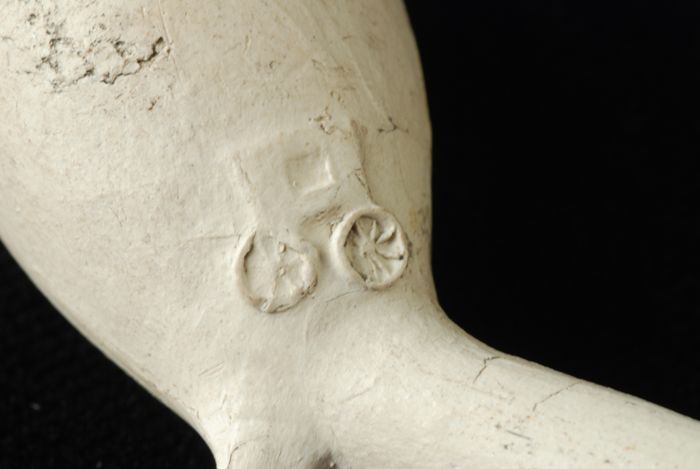 Kleipijp met spoor en merkteken in reliëf op de zijk...