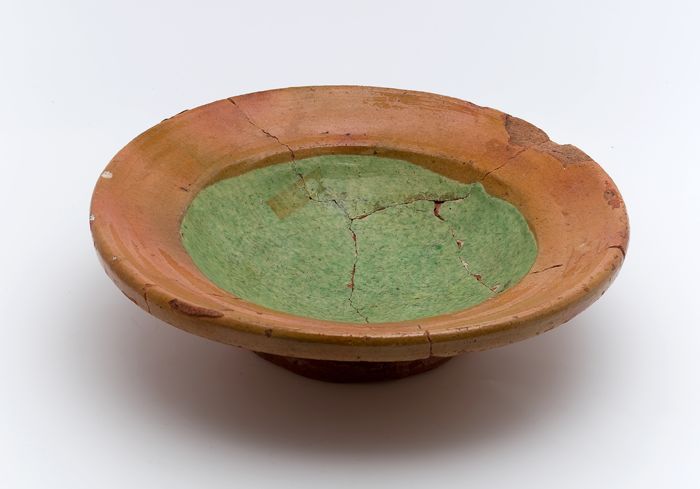 Aardewerk schotel in bruin en groen geglazuurd, op s...