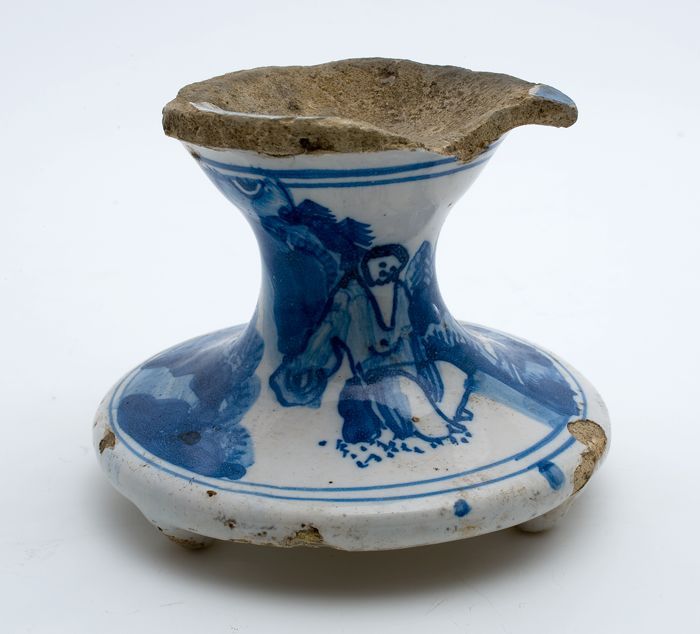 Aardewerk zoutvat op voet, decor in blauw en wit