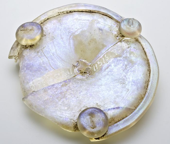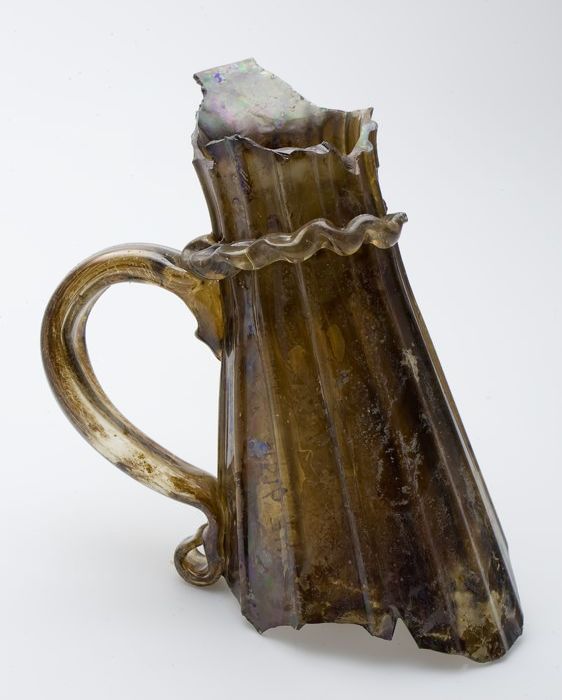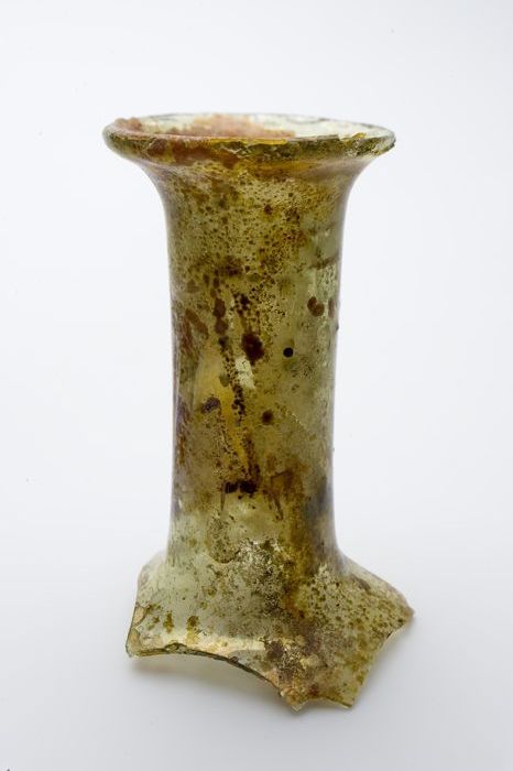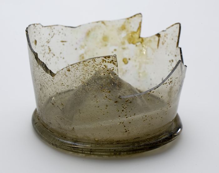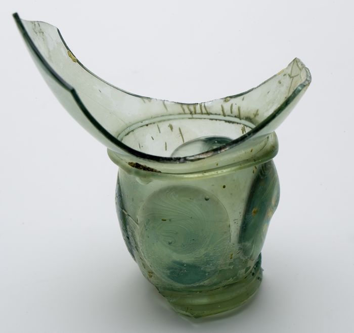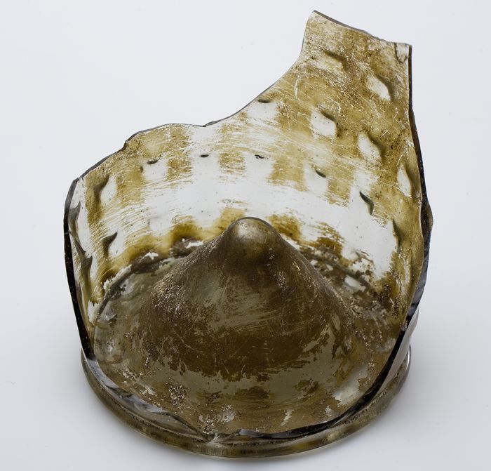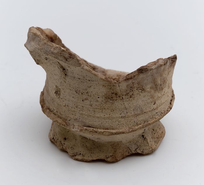 Fragment steengoed beker of kom op licht geknepen st...